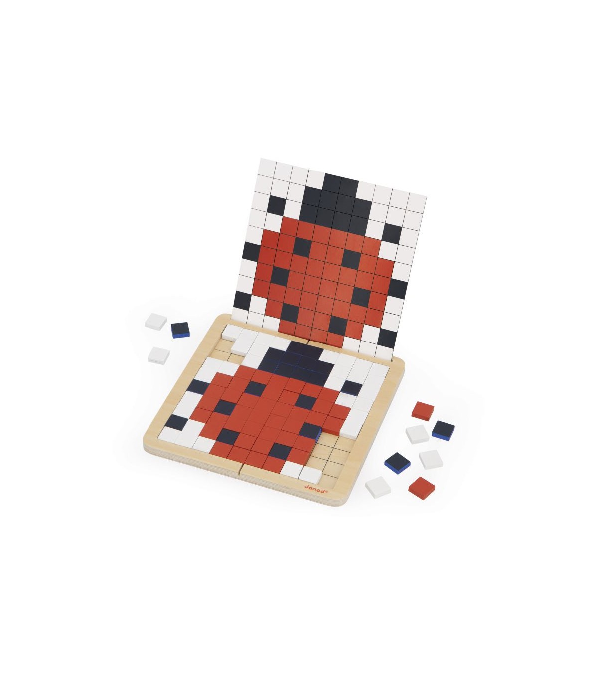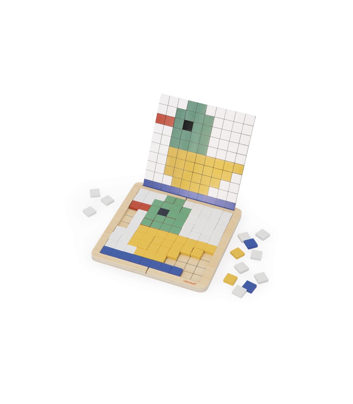 ¡Aparece una rana! Este juego educativo de codificación ofrece 4 formas diferentes de jugar: 1. Superposición: El niño coloca las fichas encima de la tarjeta en el tablero. 2. Reproducción: El niño coloca las fichas en el tablero según la tarjeta. 3. Simetría: El niño reproduce por simetría el dibujo de la media tarjeta. 4. Codificación: Gracias a los números y los colores indicados en la tarjeta, el niño descubre la ilustración oculta. En solitario o en dúo, favorece el desarrollo de la concentración y el conocimiento de los números. Está compuesto por un tablero de madera, 200 fichas de madera y 10 tarjetas modelo. Incluye una bolsa de almacenamiento. Juego educativo de madera y cartón FSCTM para niños a partir de 5 años.