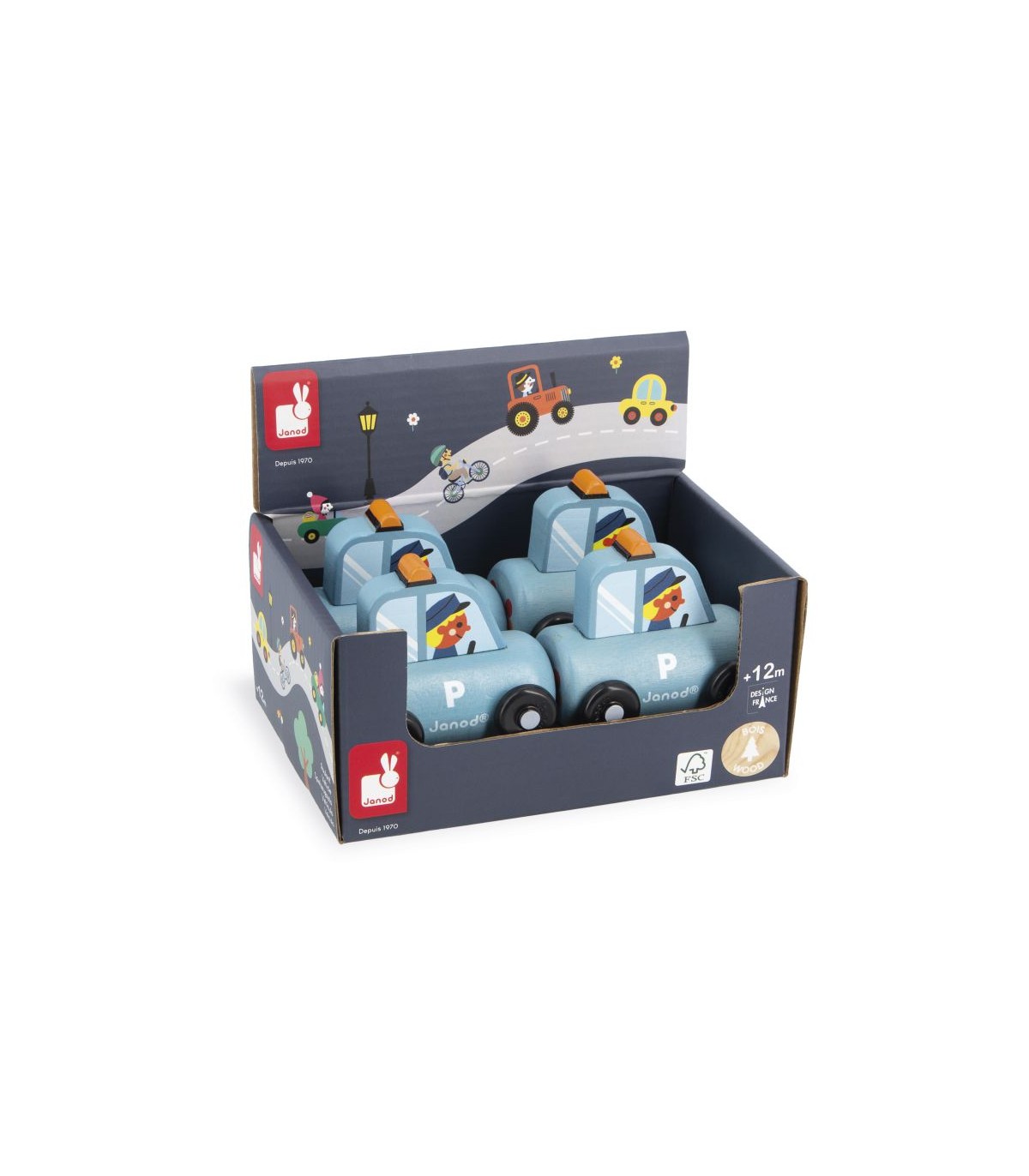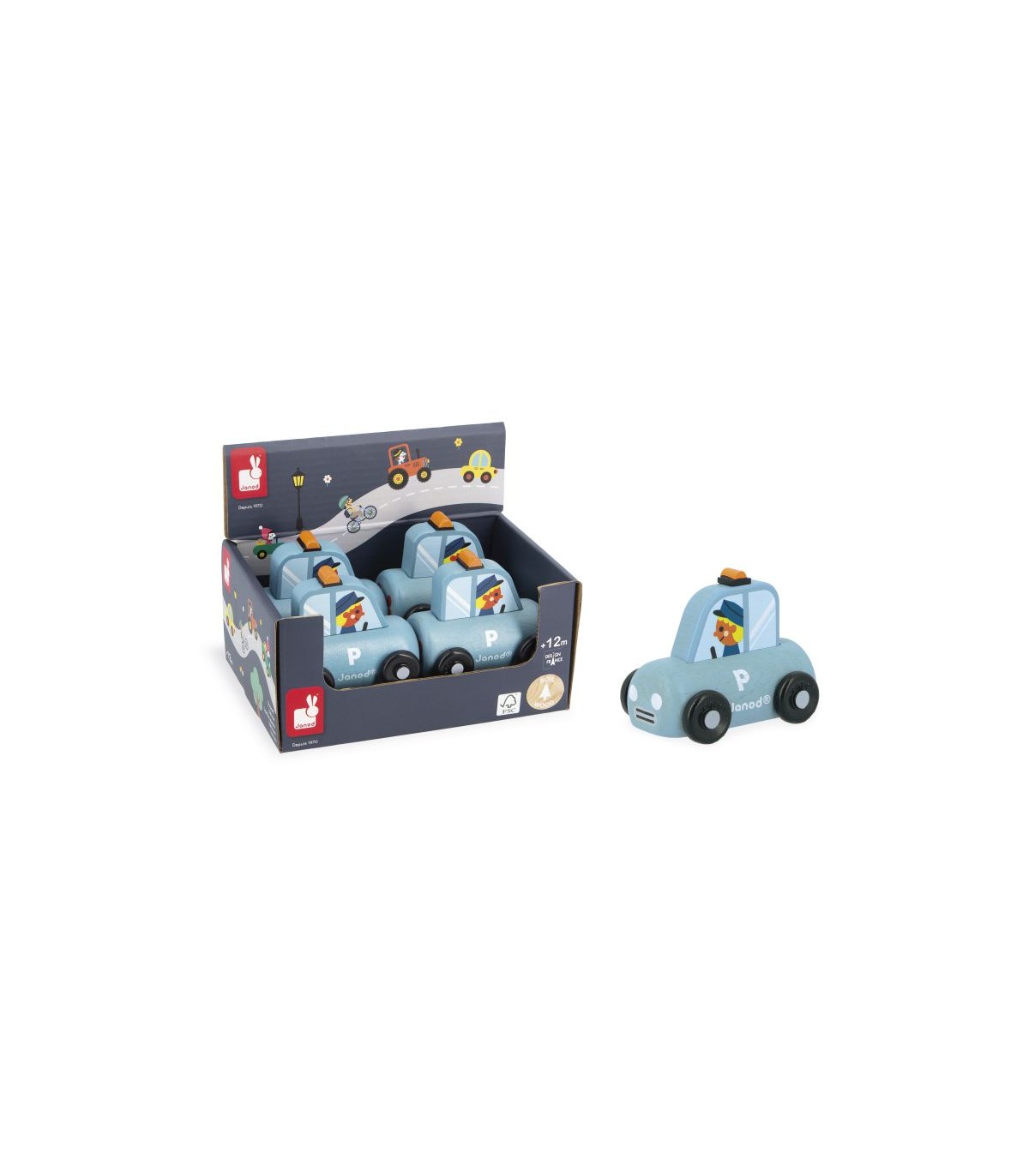 ¡Tendremos muchas misiones emocionantes a bordo del coche de policía! Con este coche de madera, los más pequeños podrán imaginar un sinfín de historias. Los más pequeños pueden agarrar el coche fácilmente. Juguete de madera FSCTM para niños a partir de 12 meses. Combinado con tu alfombra y la bonita caja de cubos de la gama Janod, este juguete con ruedas completa a la perfección tu universo.