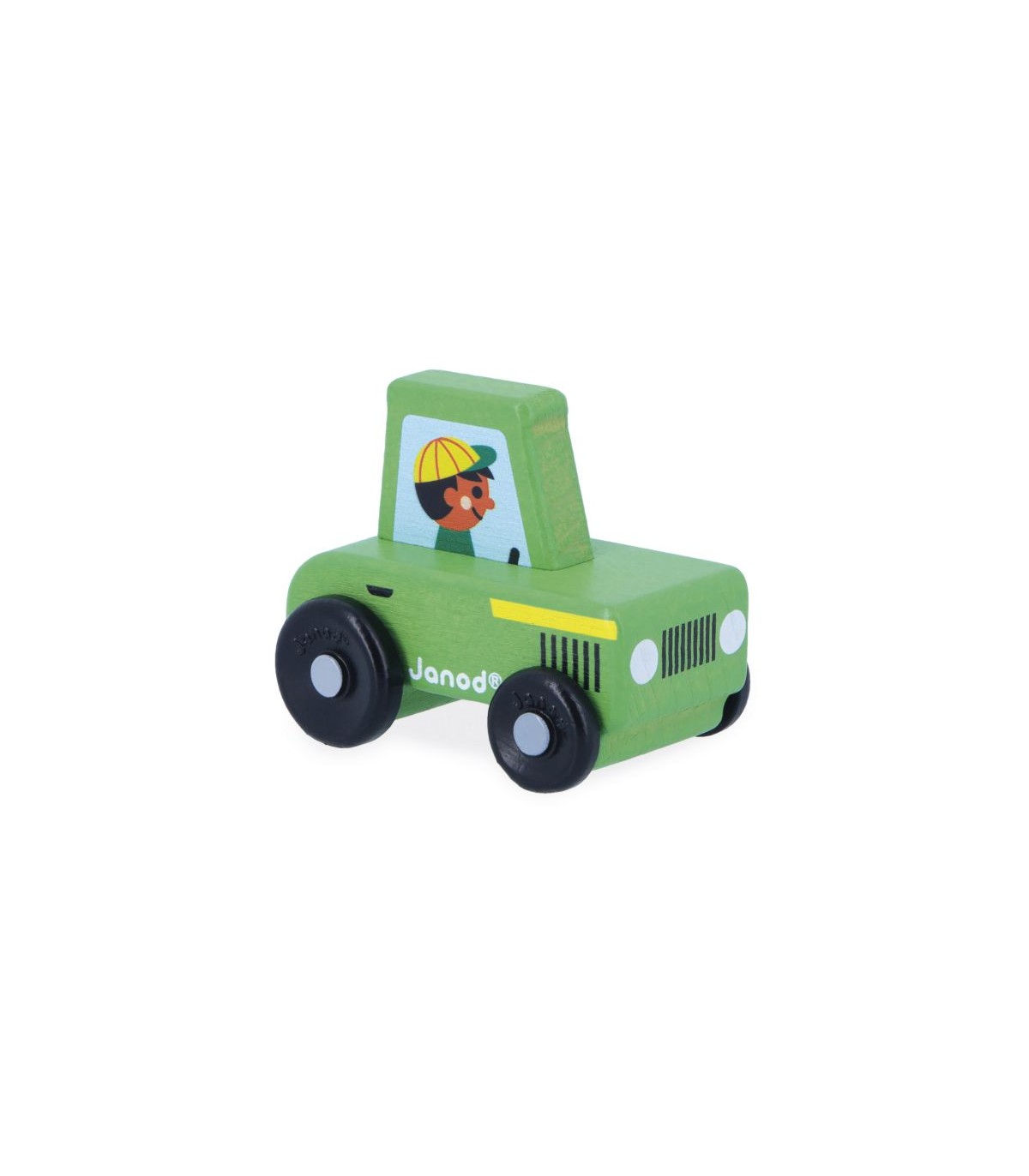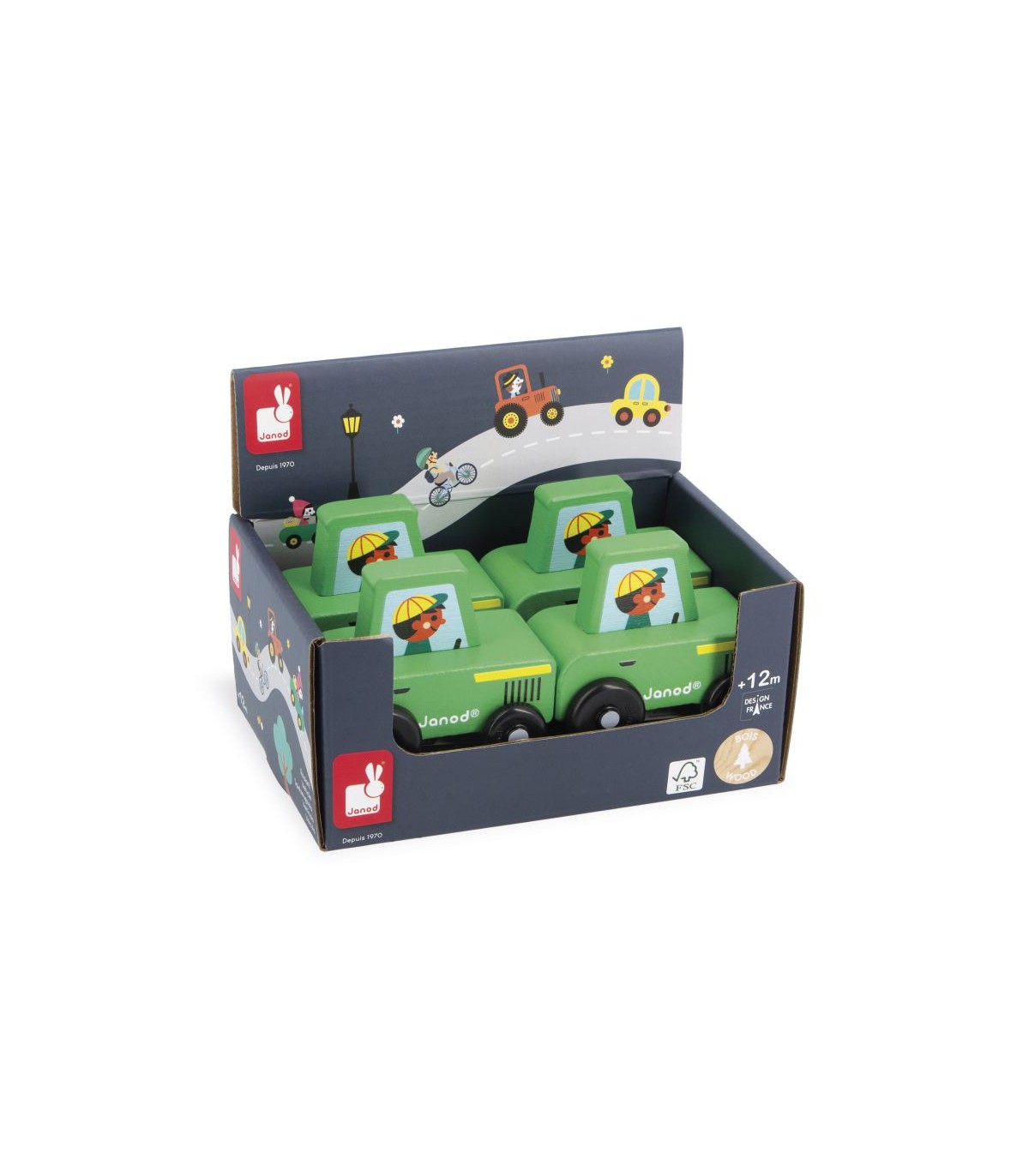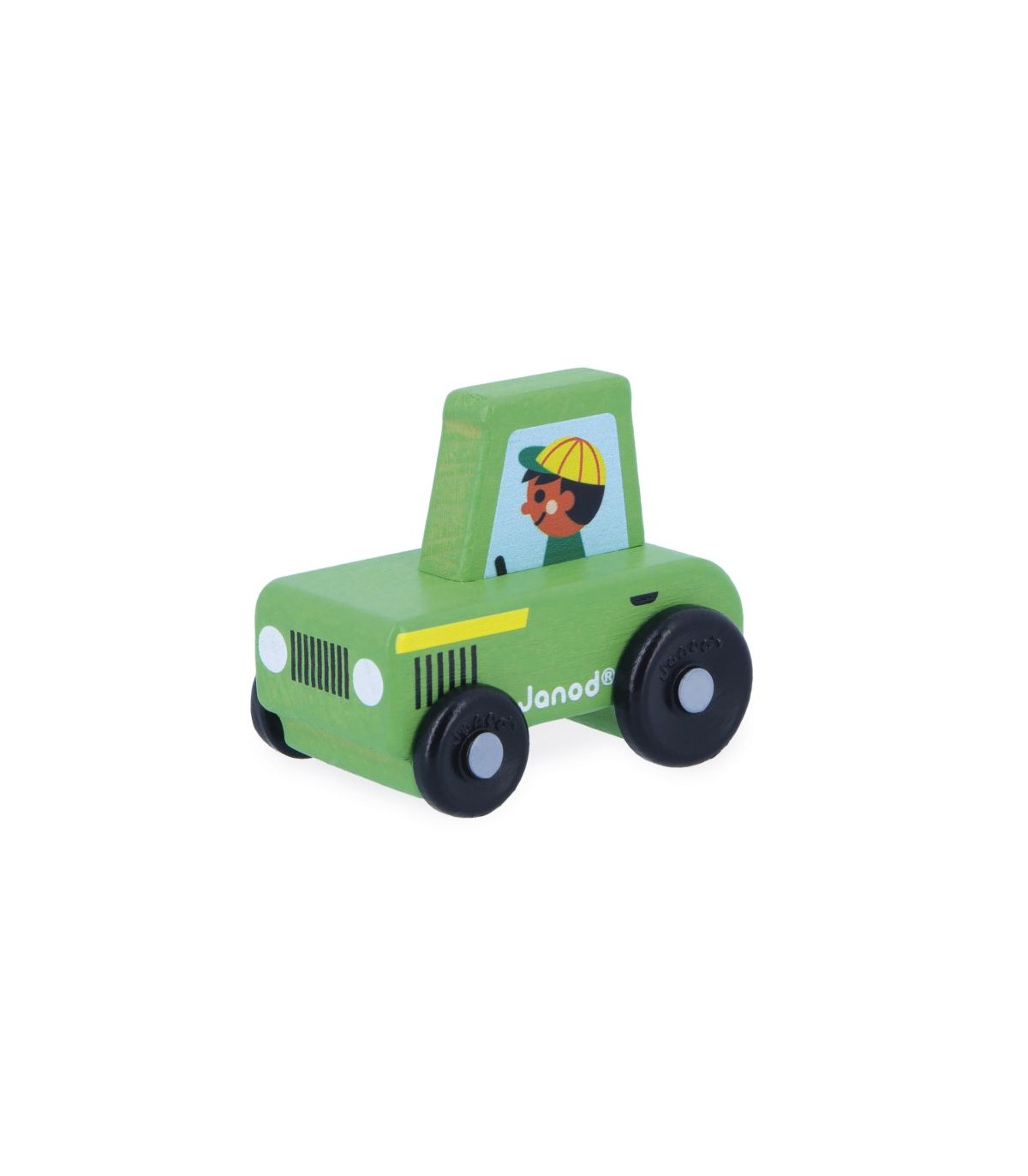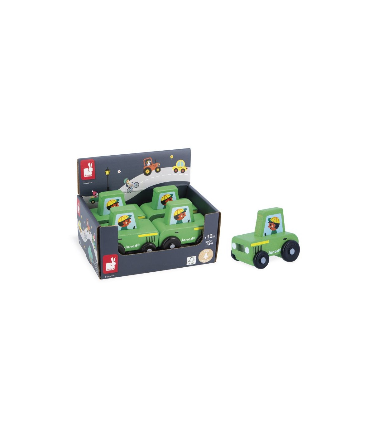 El granjero está en su tractor yendo a recoger los fardos de paja del prado. Imagina grandes historias en la granja con este tractor de madera. Gracias a su forma, los más pequeños pueden agarrar este tractor fácilmente. Juguete de madera FSCTM para niños a partir de 12 meses. Combinado con tu alfombra y la bonita caja de cubos de la gama Janod, este juguete con ruedas completa a la perfección tu universo