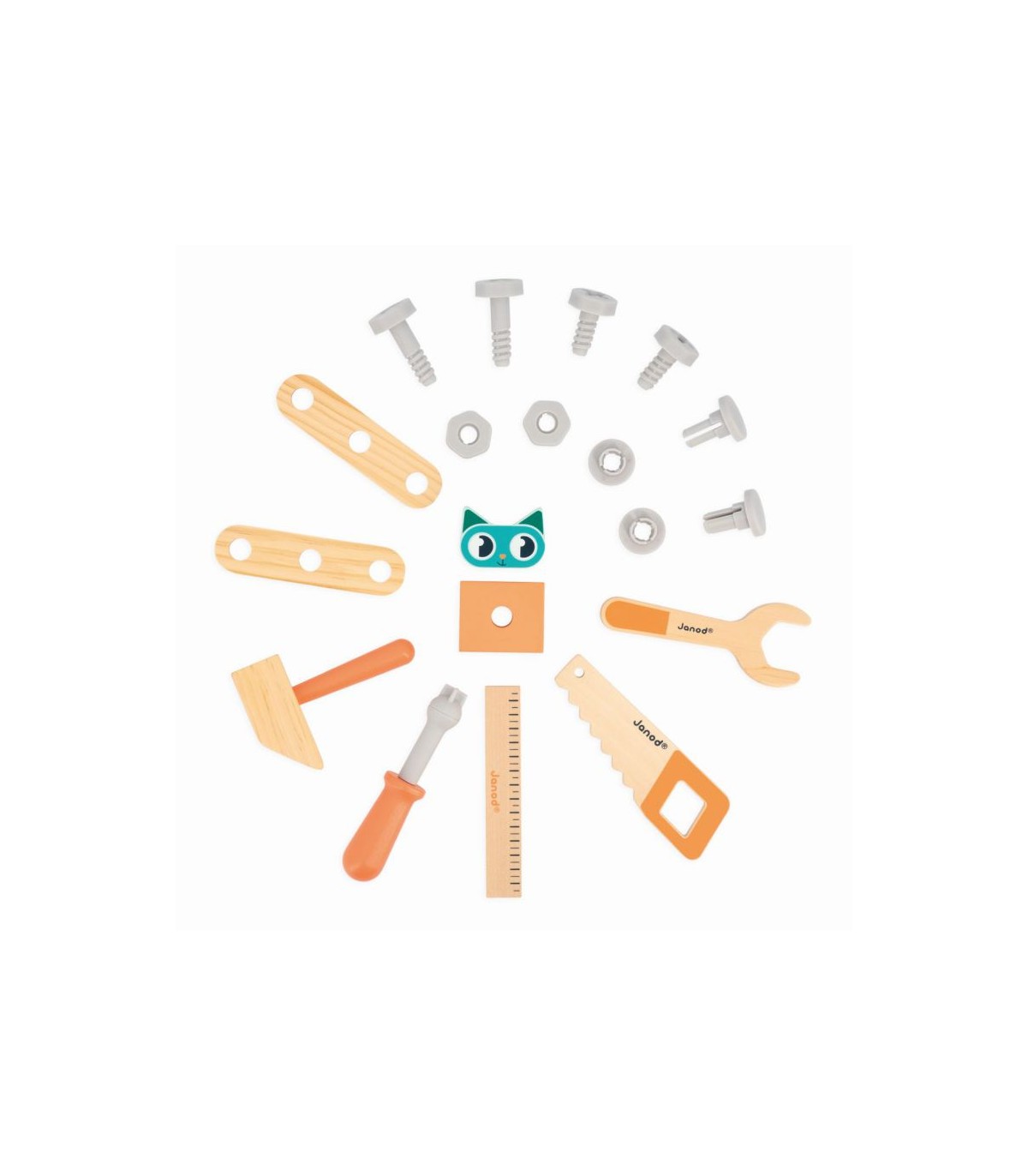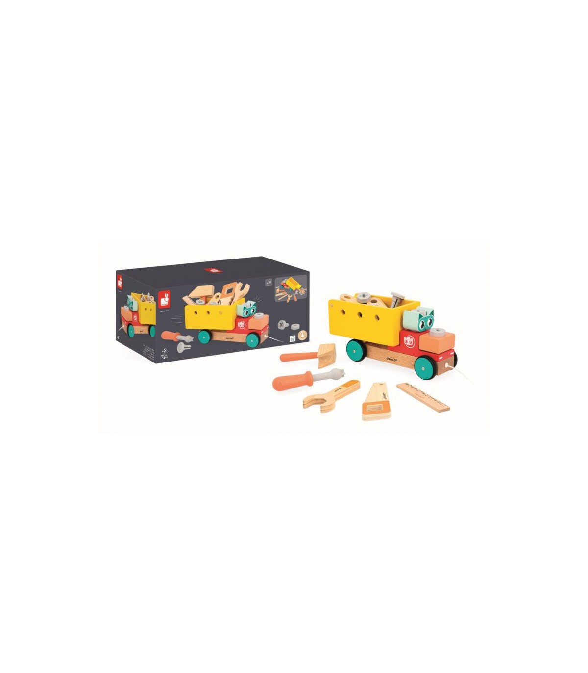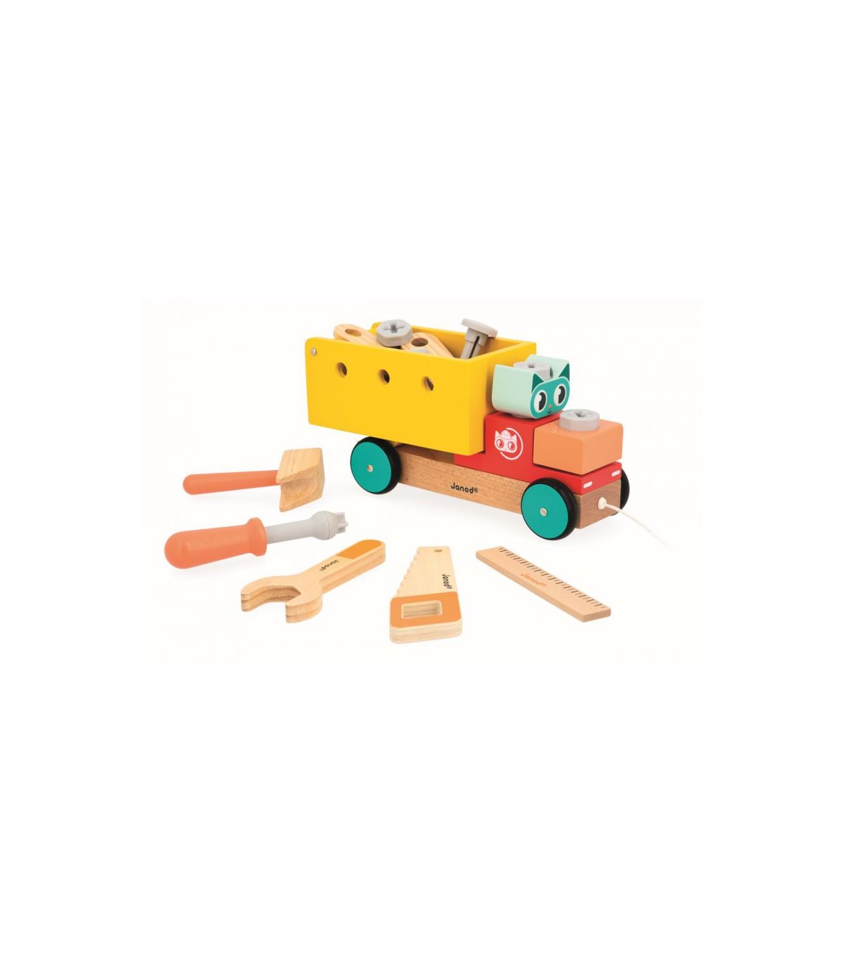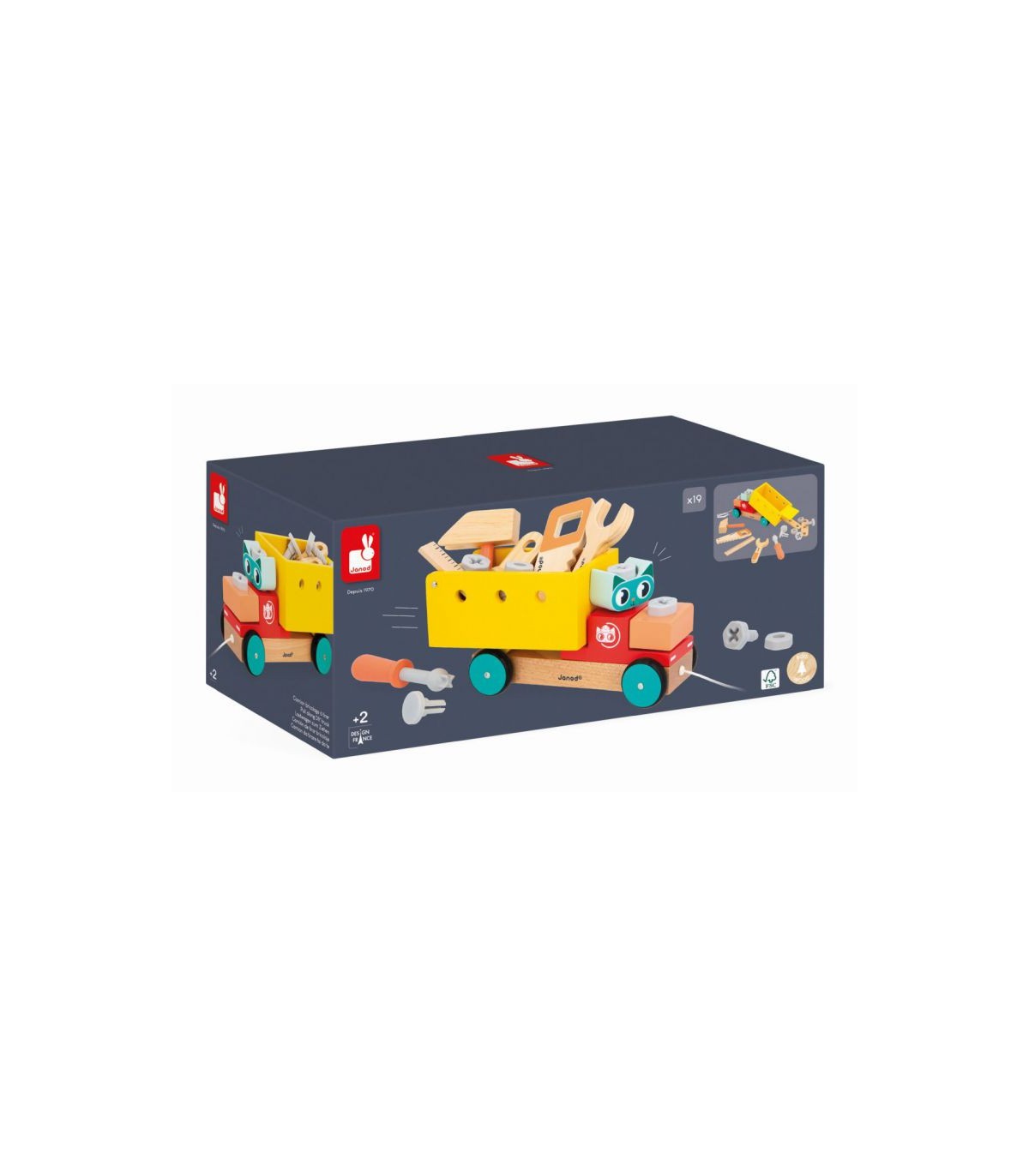 ¡Atención, ha llegado el camión de bricolaje! Este camión 2-en-1 ayudará a su hijo desde los primeros años a aprender a andar, gracias a su cuerda para tirar de él. Además, su lado de construcción permitirá a su hijo desarrollar su destreza y su imaginación. Está compuesto por un remolque que se levanta, 4 accesorios de madera, 10 accesorios de plástico para enroscar y desenroscar una y otra vez, y 5 herramientas para clavar los clavos, medir la superficie de la obra ¡o incluso cortar las tablas! Un pequeño plus: los tornillos tienen muesca para añadir un poco más de jugabilidad y dificultad. Juguete de madera FSC. Juguete de estimulación para tirar para niños a partir de 2 años.