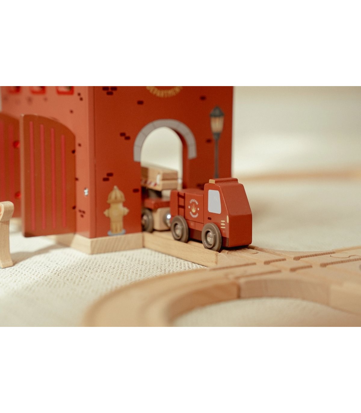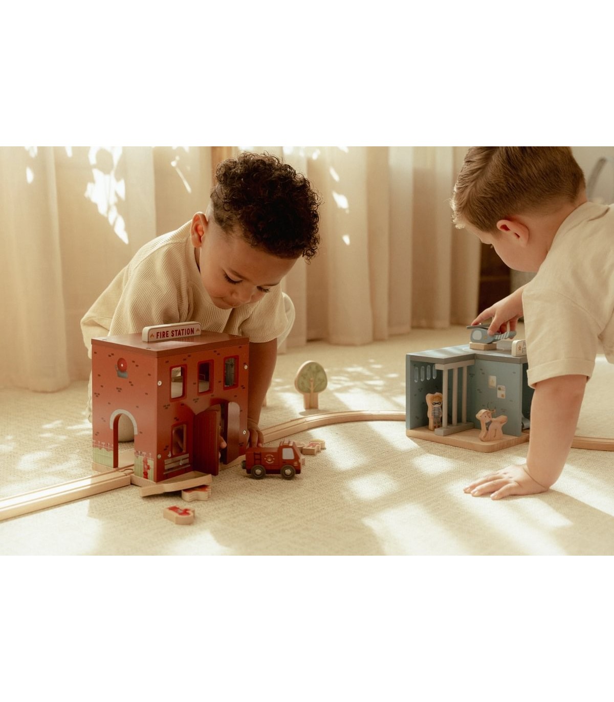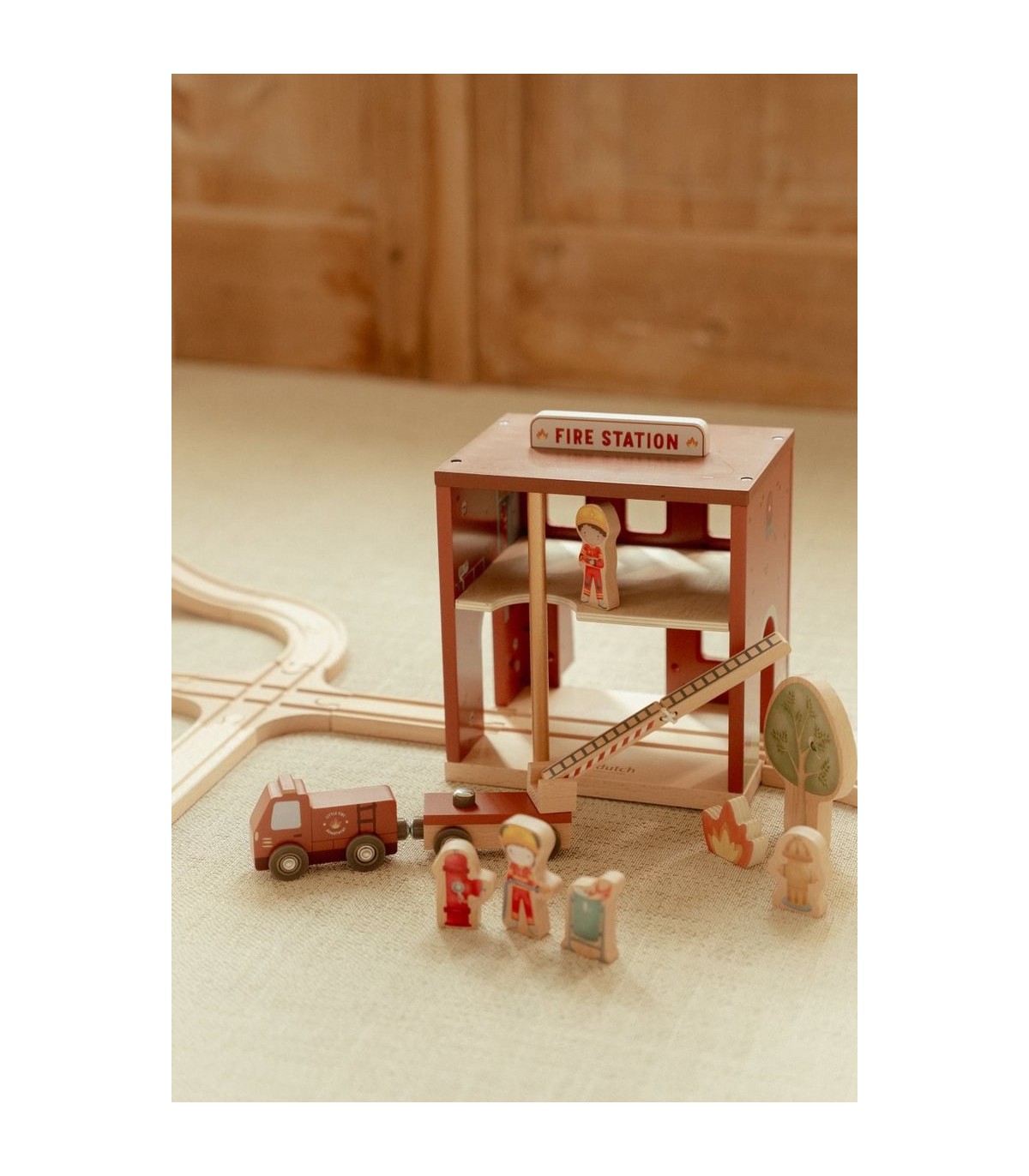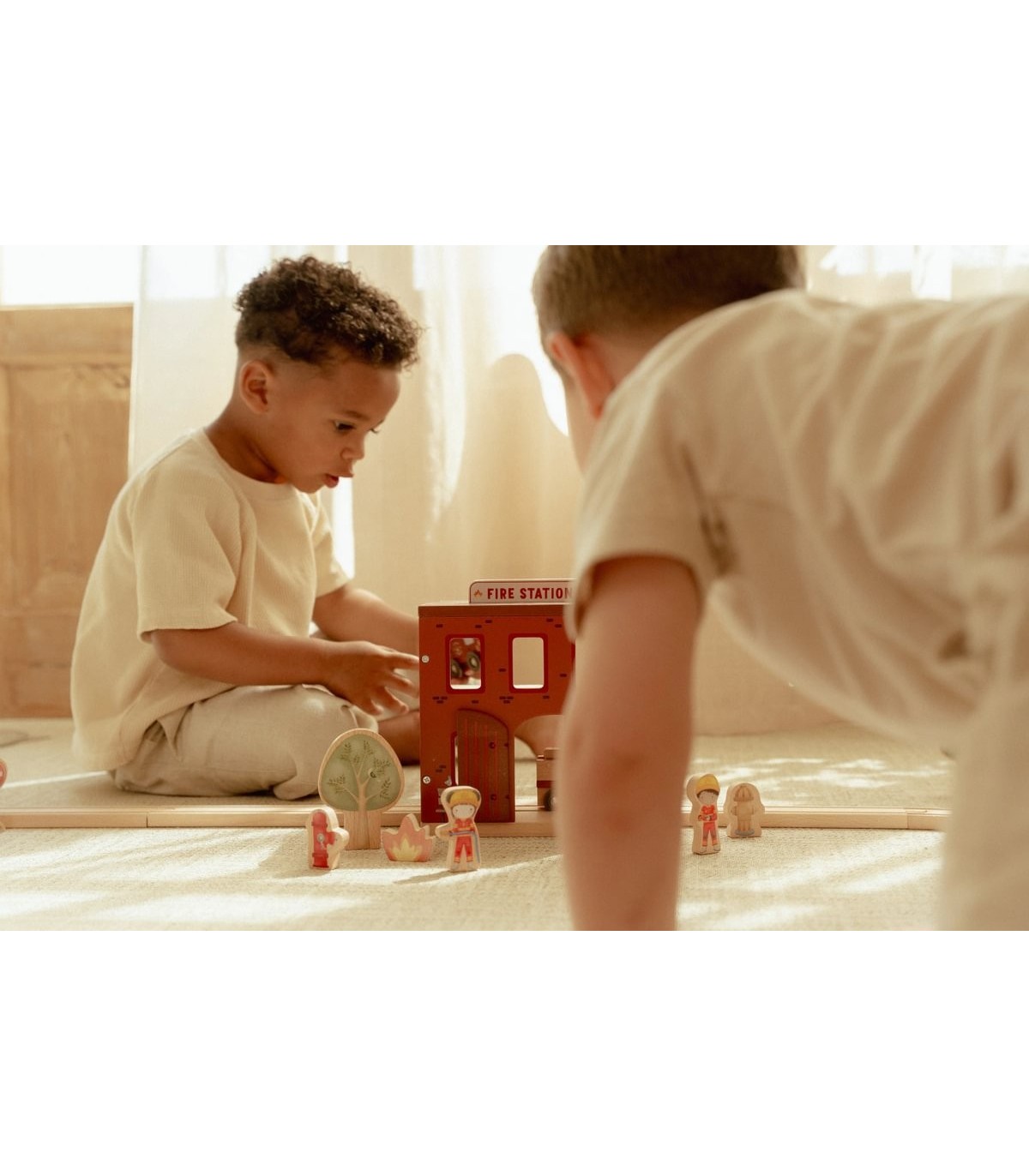¡Suena la alarma! Esta estación de bomberos de madera tiene todo lo necesario para una emocionante misión de rescate. Abre las puertas, deslízate por la pértiga y súbete al camión de bomberos. Incluye bomberos, llamas y un cubo de basura en llamas. Las puertas de la estación se abren, lo que permite una salida rápida. Combina este set con el tren de madera XL para vivir aún más aventuras. ¿A quién rescatarás hoy?