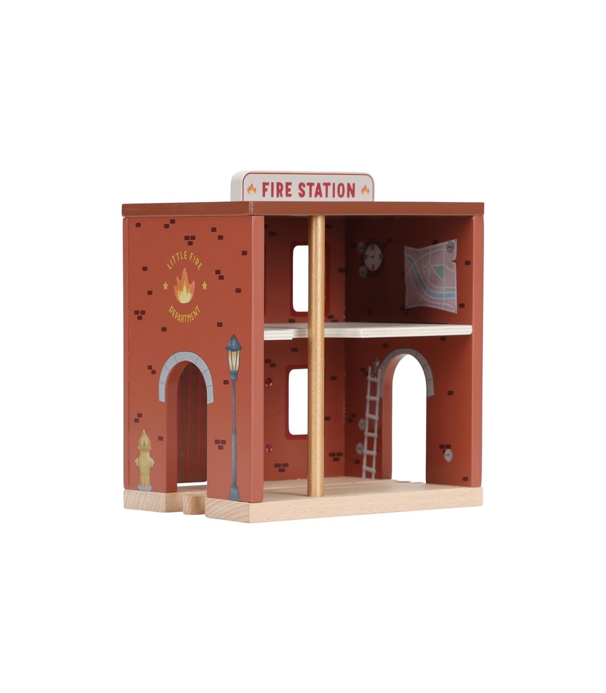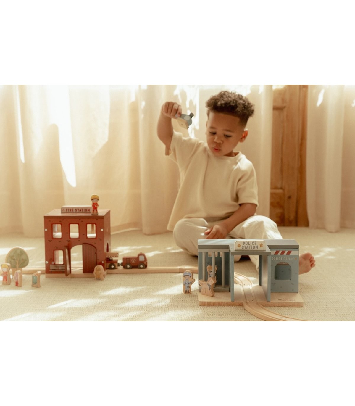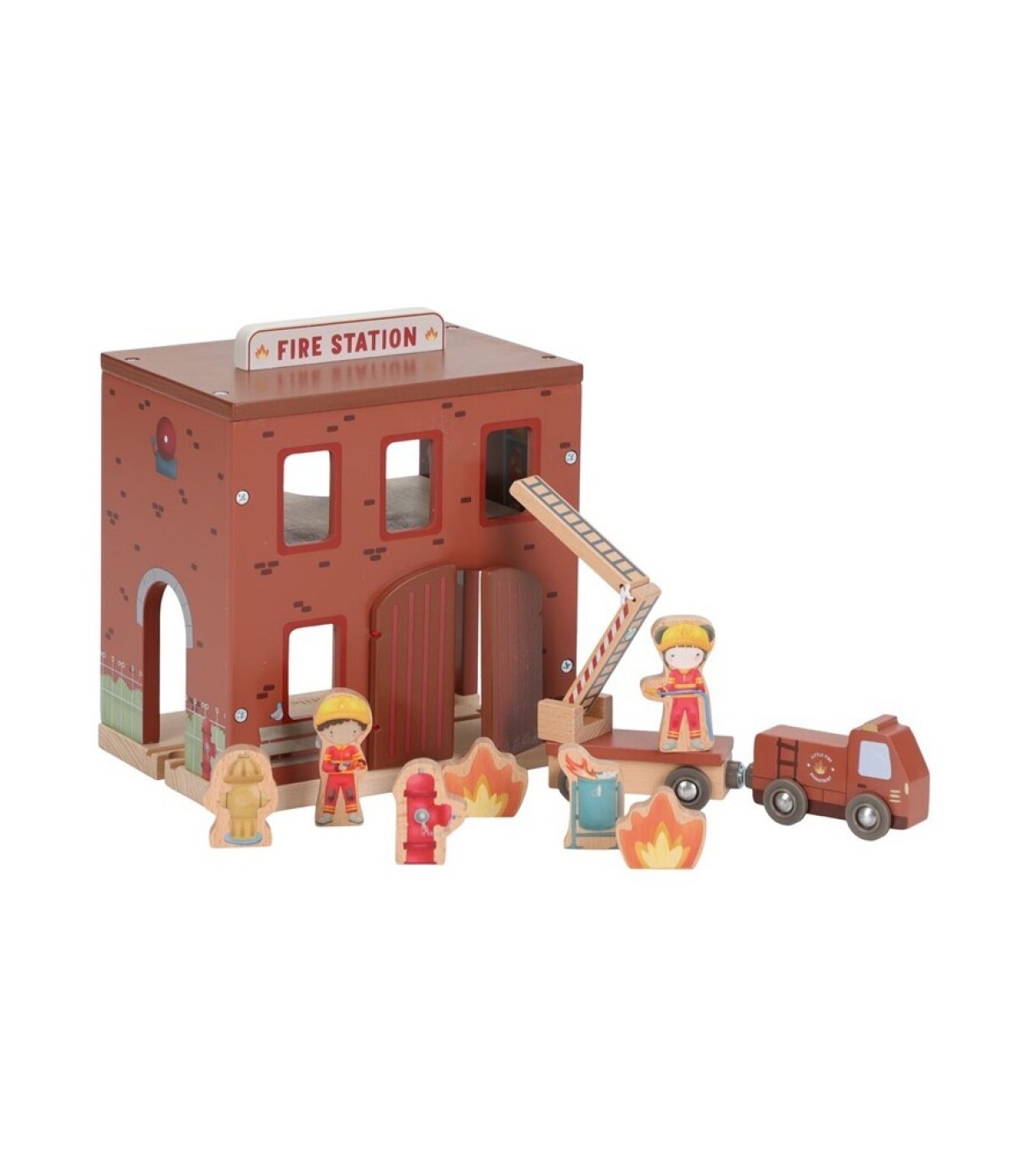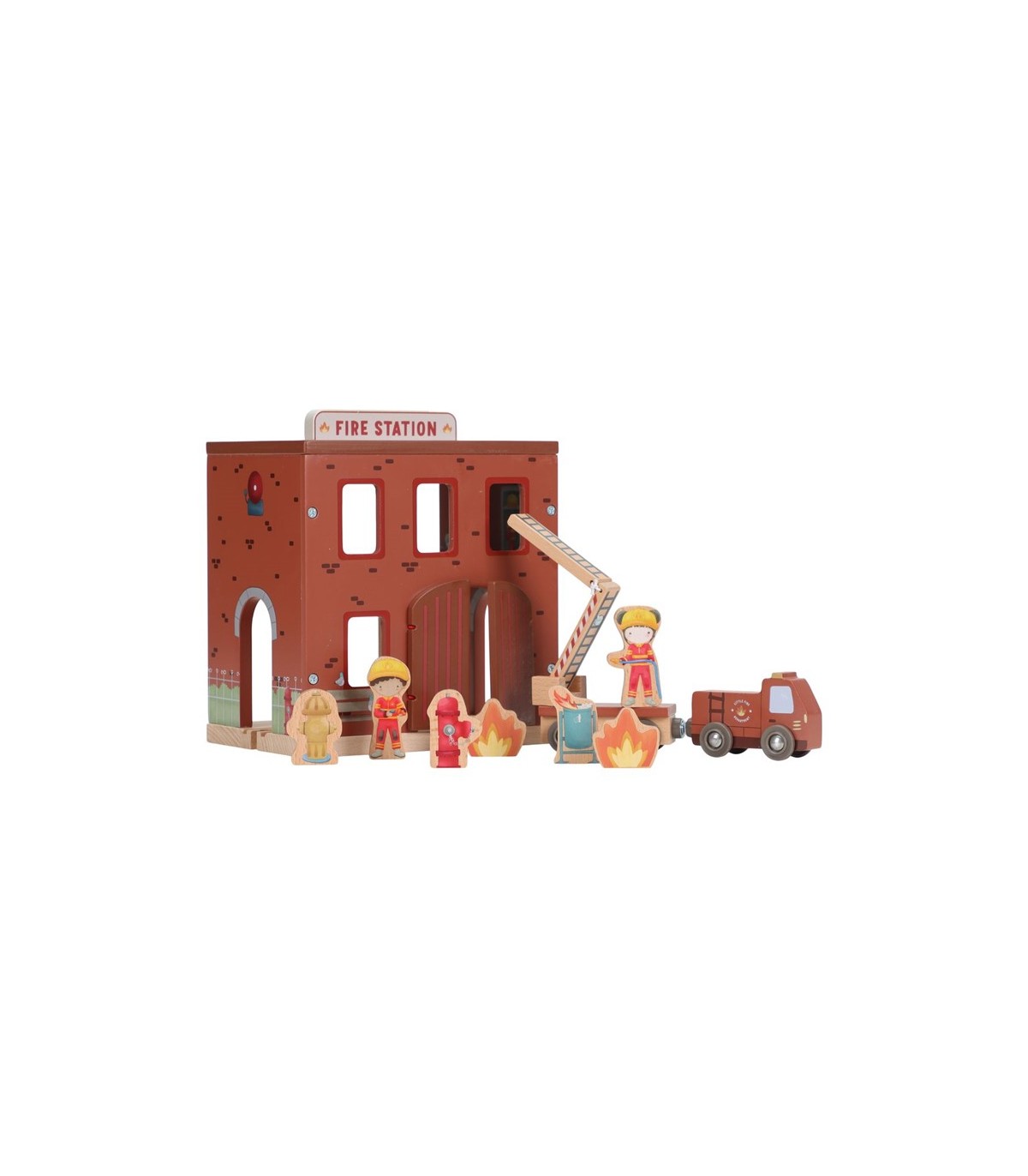 ¡Suena la alarma! Esta estación de bomberos de madera tiene todo lo necesario para una emocionante misión de rescate. Abre las puertas, deslízate por la pértiga y súbete al camión de bomberos. Incluye bomberos, llamas y un cubo de basura en llamas. Las puertas de la estación se abren, lo que permite una salida rápida. Combina este set con el tren de madera XL para vivir aún más aventuras. ¿A quién rescatarás hoy?
