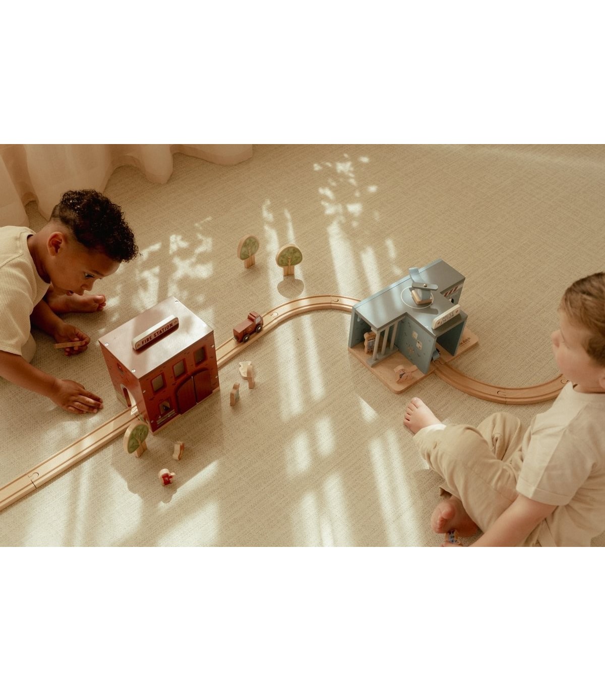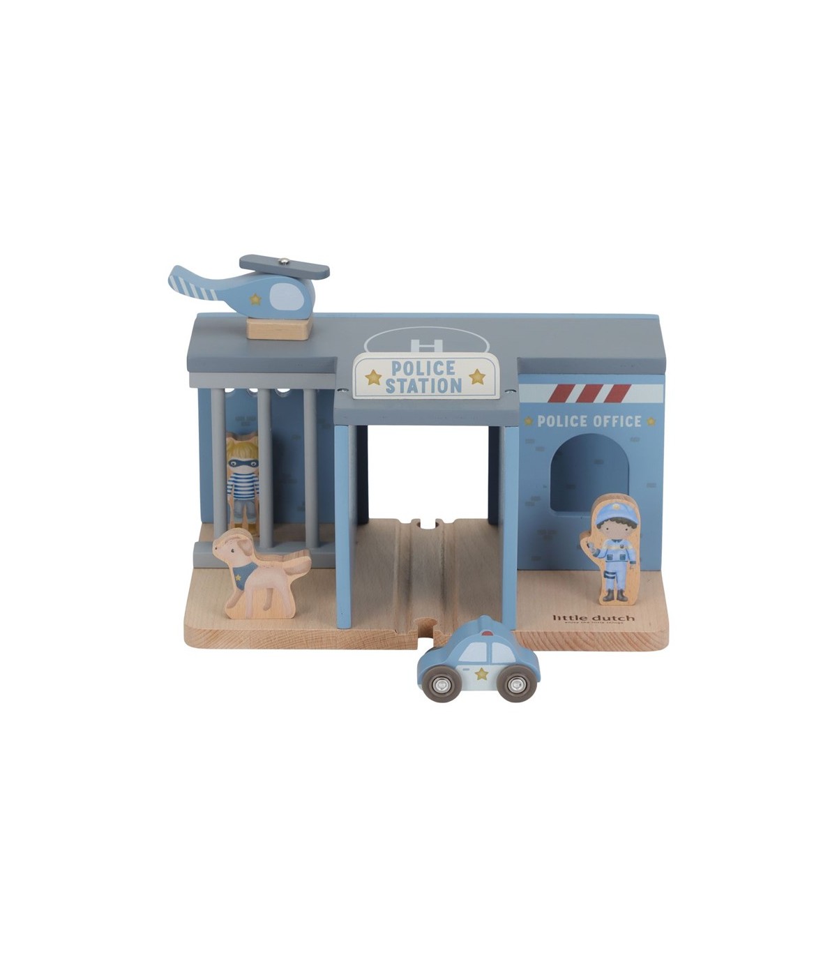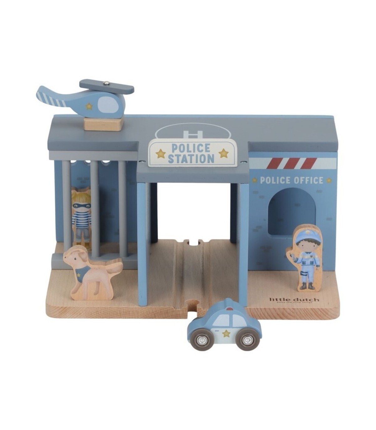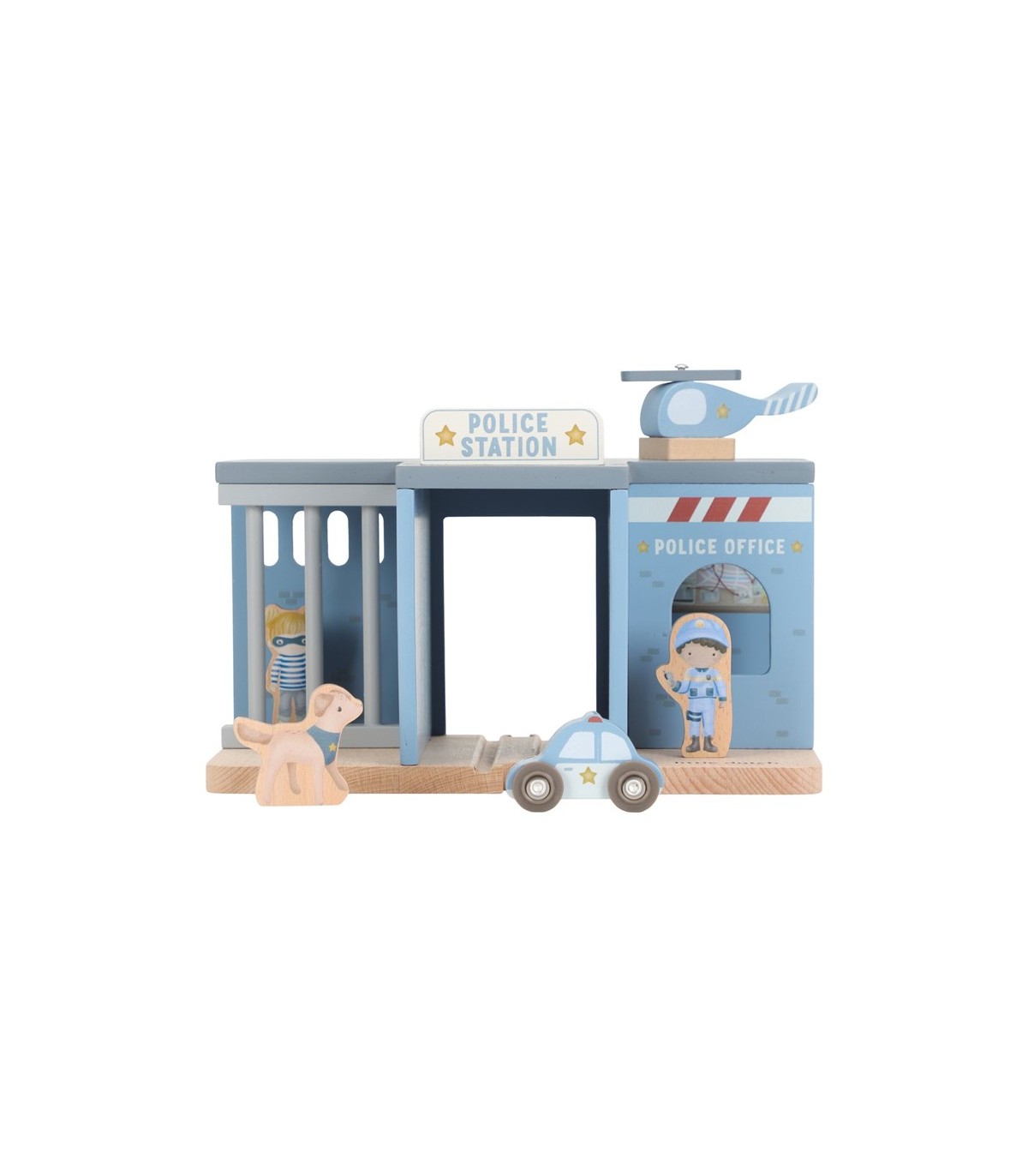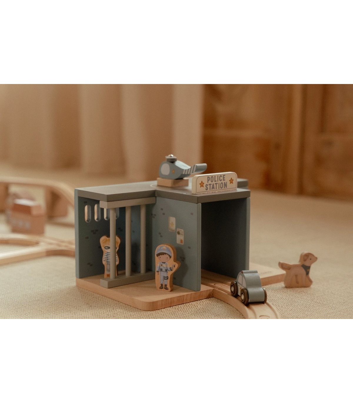 ¡Ladrón descubierto! Esta comisaría de madera lo tiene todo para crear emocionantes historias policiales. Incluye un coche patrulla, un helicóptero, un agente, un ladrón e incluso un perro policía. La comisaría cuenta con una celda con barrotes y una plataforma de aterrizaje. Encierra al ladrón y mantén la ciudad a salvo. Este juguete de comisaría es el complemento perfecto para la vía del tren de madera XL y fomenta el juego imaginativo. ¿A quién llevarás a la comisaría?