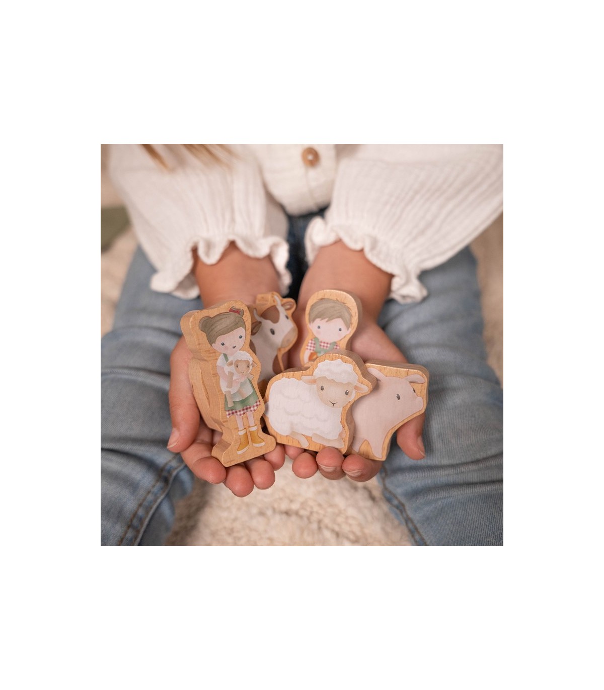 ¡Toc, toc! Embárcate en infinitas aventuras con esta vía de tren de madera de la colección Little Farm. Súbete al tren y dirígete a la granja con todos los animales. ¡Qué viaje tan acogedor! Cada figura de madera está ilustrada en detalle en ambos lados.