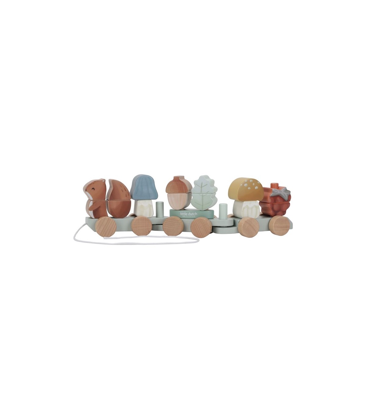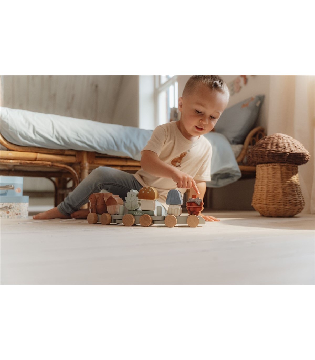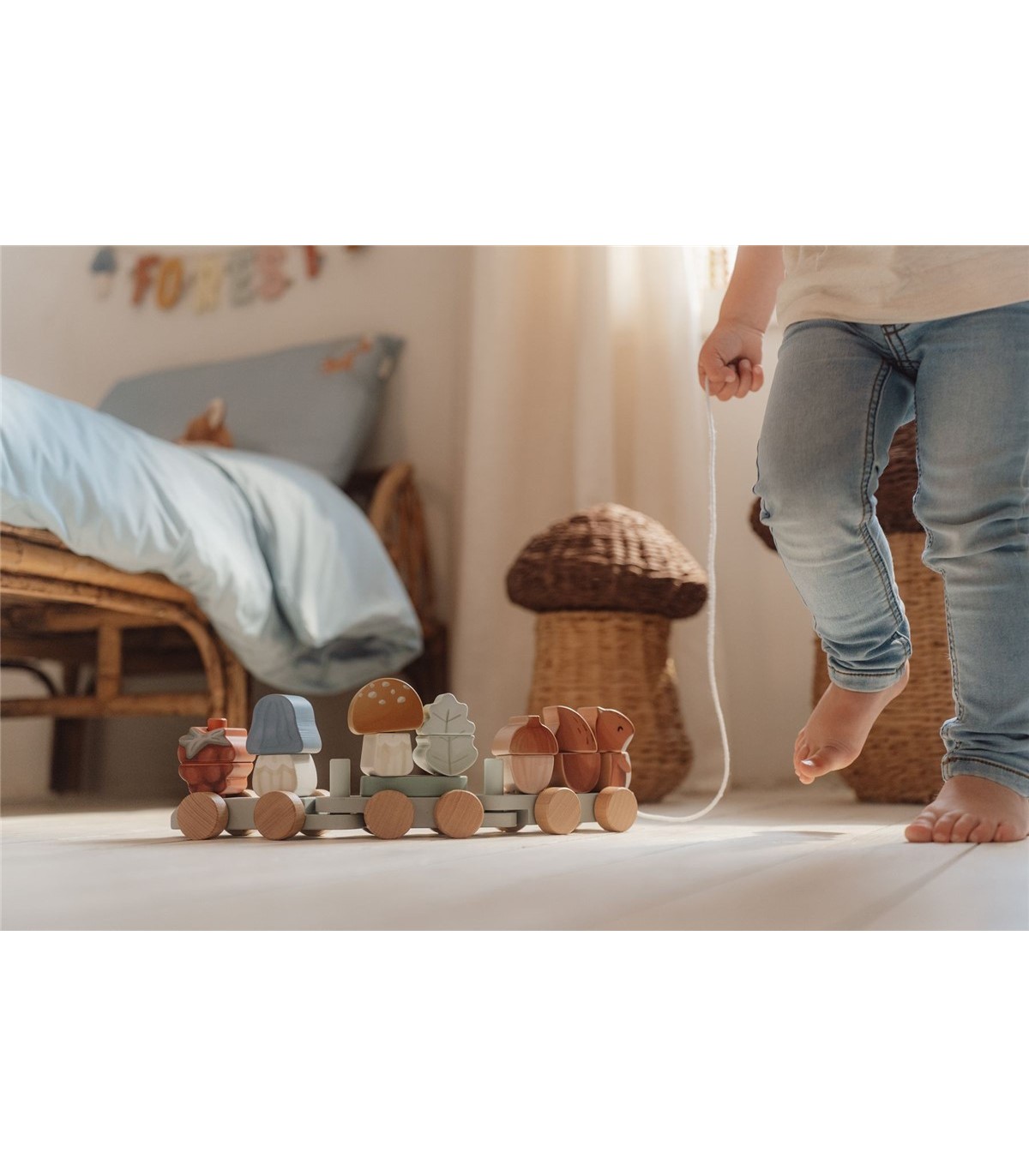 ¡Chú, chú! Reúne a todos los adorables animales, setas y tesoros del bosque y súbete a bordo para emprender un viaje mágico con Forest Friends. Apila todos los bloques uno por uno en los tres vagones de este tren de madera apilable. La ardilla tomará la delantera y se sentará en la parte delantera. ¿Qué hongo seguirá y adónde irá la piña? Cada bloque se convierte en una pieza de la historia de tu imaginación. Una forma divertida de jugar y desarrollar la coordinación mano-ojo al mismo tiempo. El tren incluye 18 piezas y mide aproximadamente 45 cm de largo.