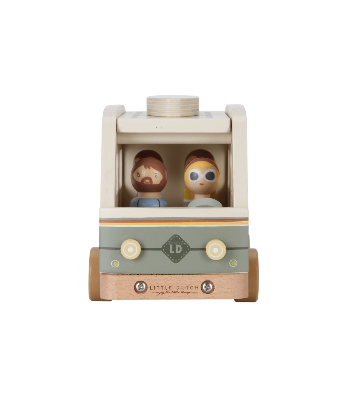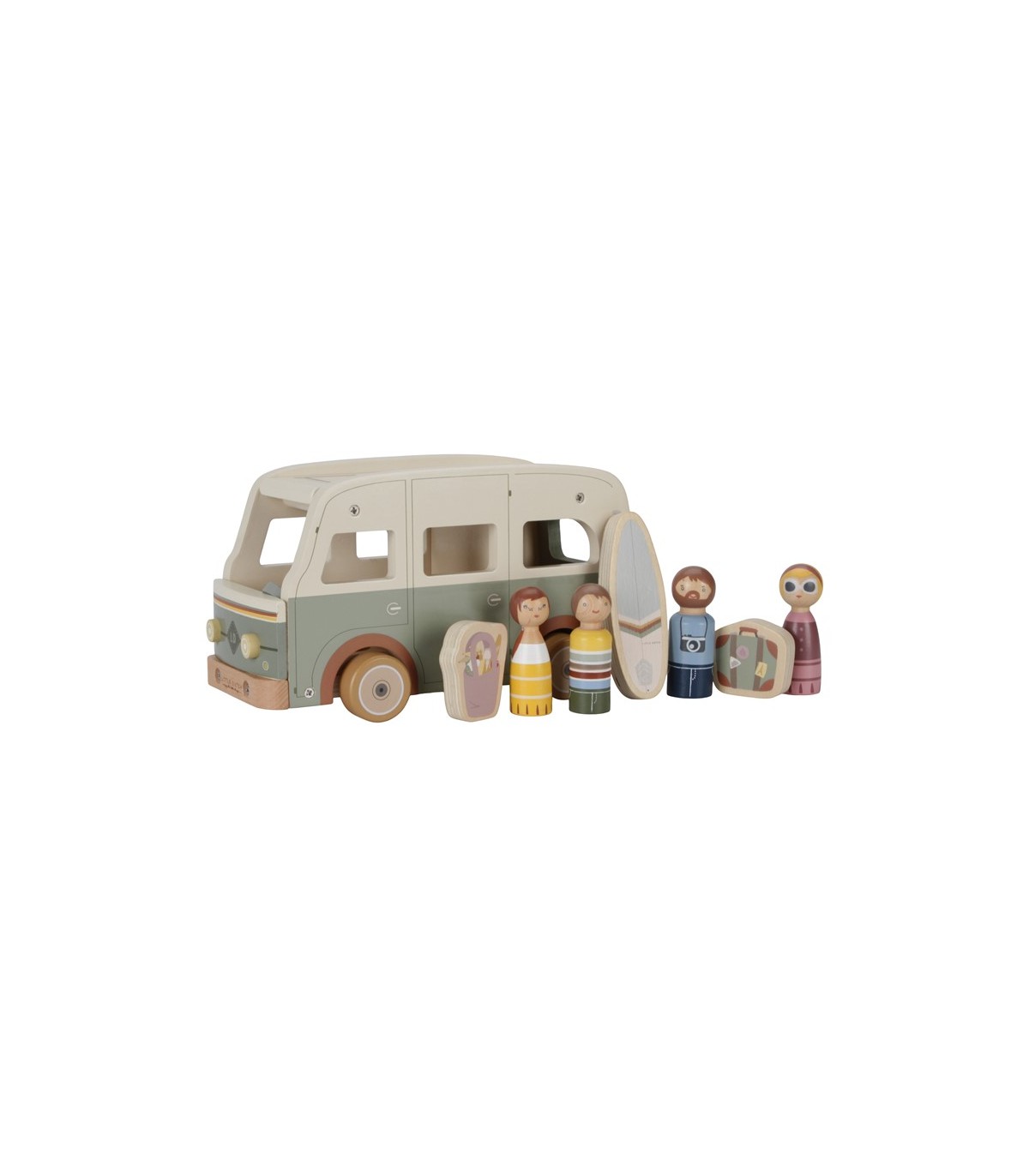 ¡Vamos a dar un paseo juntos! Levanta el techo de tu furgoneta retro y coloca los muñecos encajables en su interior.Furgoneta retro con accesorios como tabla de surf, maleta y bolsa de la compra en bonitos colores retro.