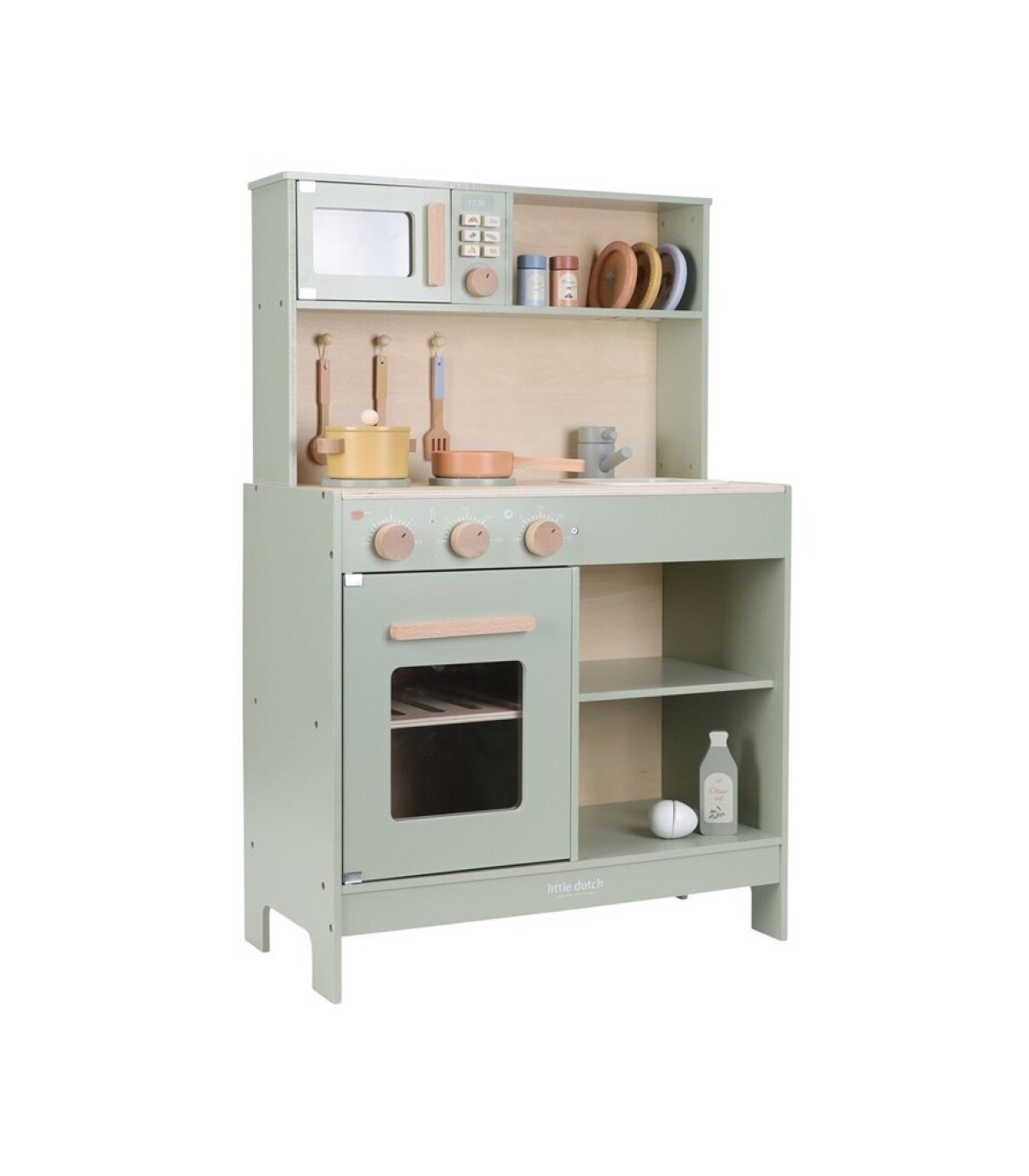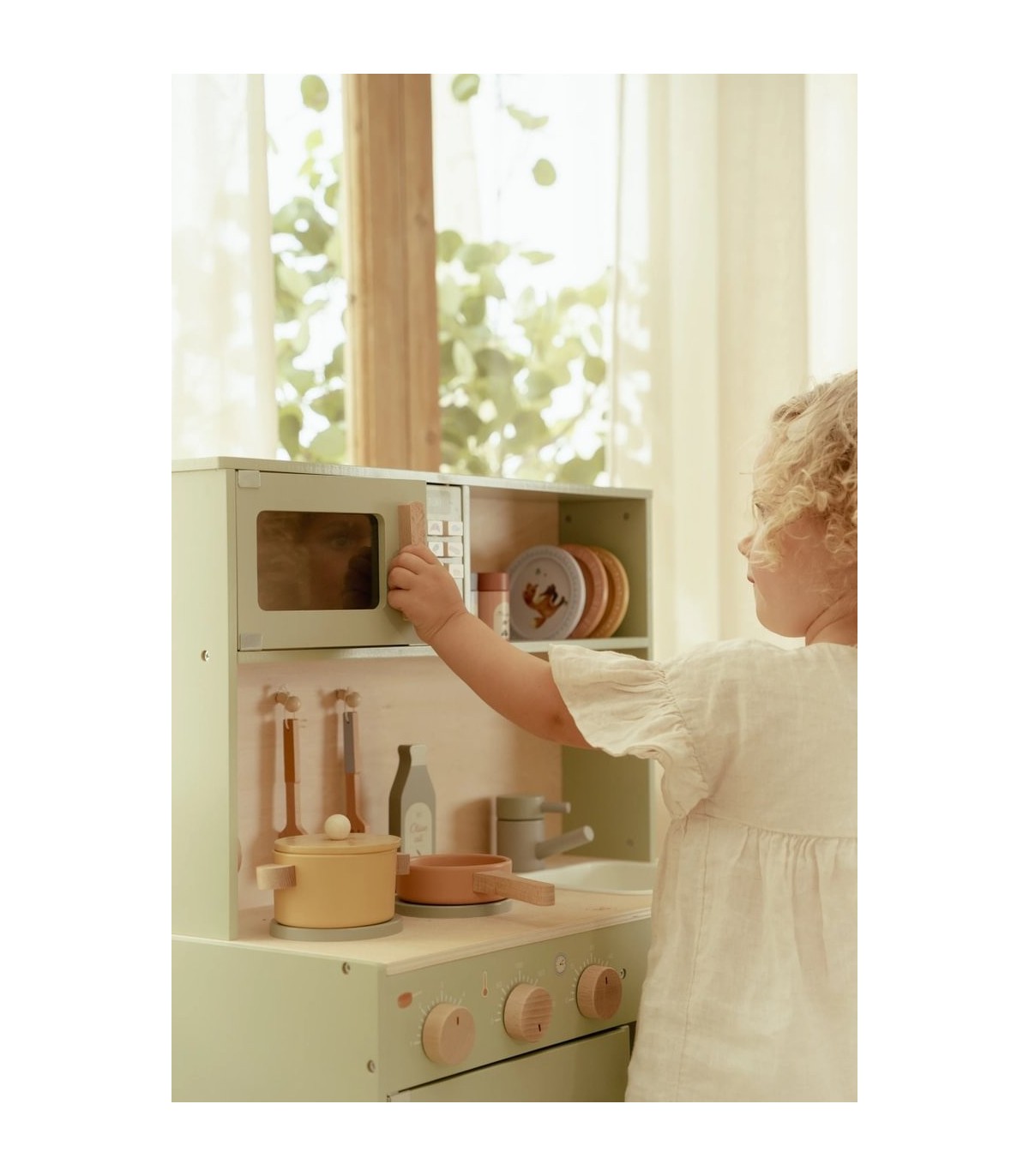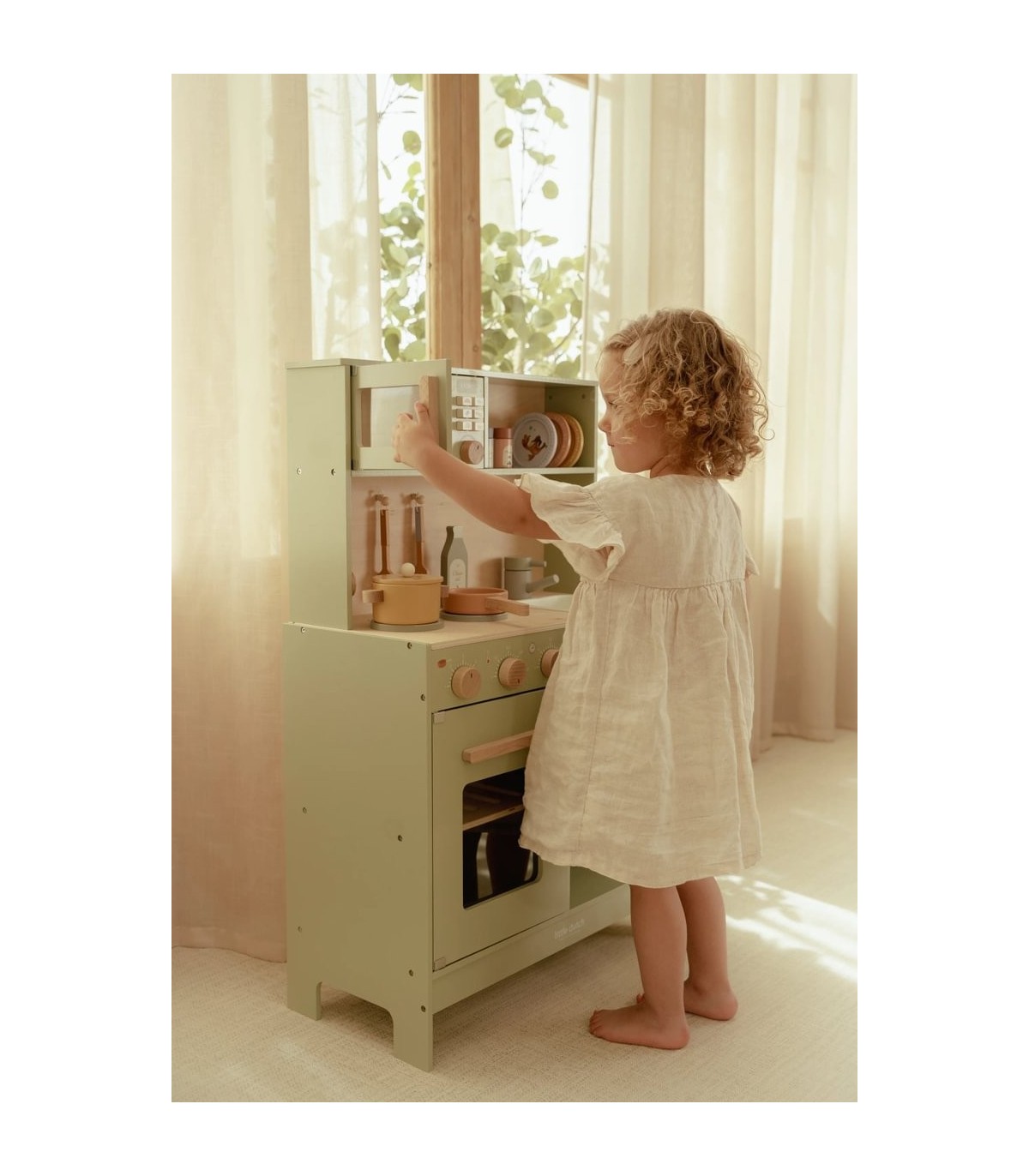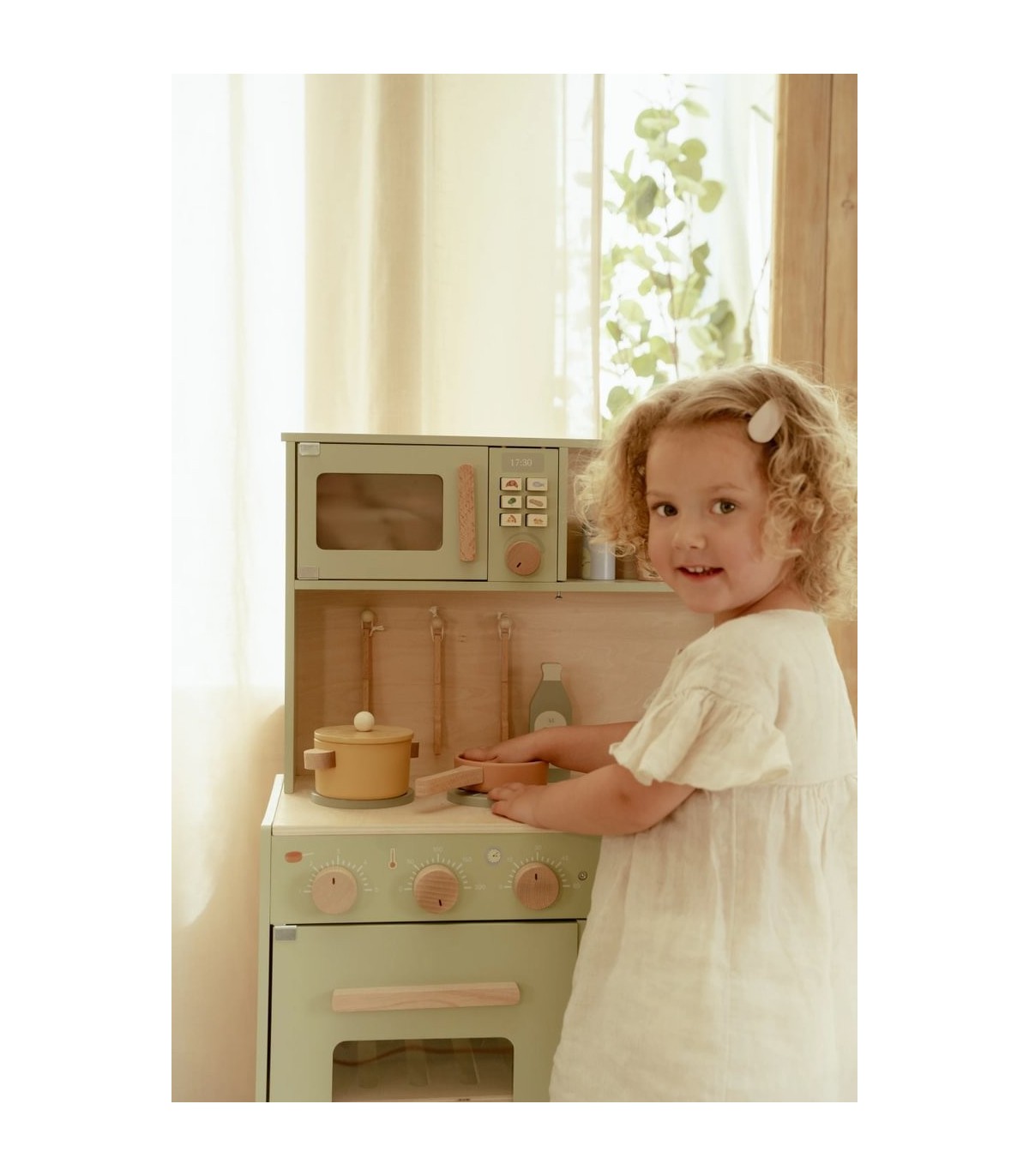 ¡Los pequeños chefs pueden ponerse manos a la obra en esta preciosa cocina de juguete de madera color menta! Hornean un delicioso pastel, cocinan verduras frescas en el horno o fríen un huevo en la sartén. La cocina está completamente equipada con dos sartenes, utensilios de cocina, tres platos y un fregadero para lavarse las manos. También incluye una botella de aceite de oliva, un juego de sal y pimienta, y un armario para guardar los comestibles. El microondas tiene perillas reales con ilustraciones para mayor diversión. ¿Qué hay para cocinar hoy?