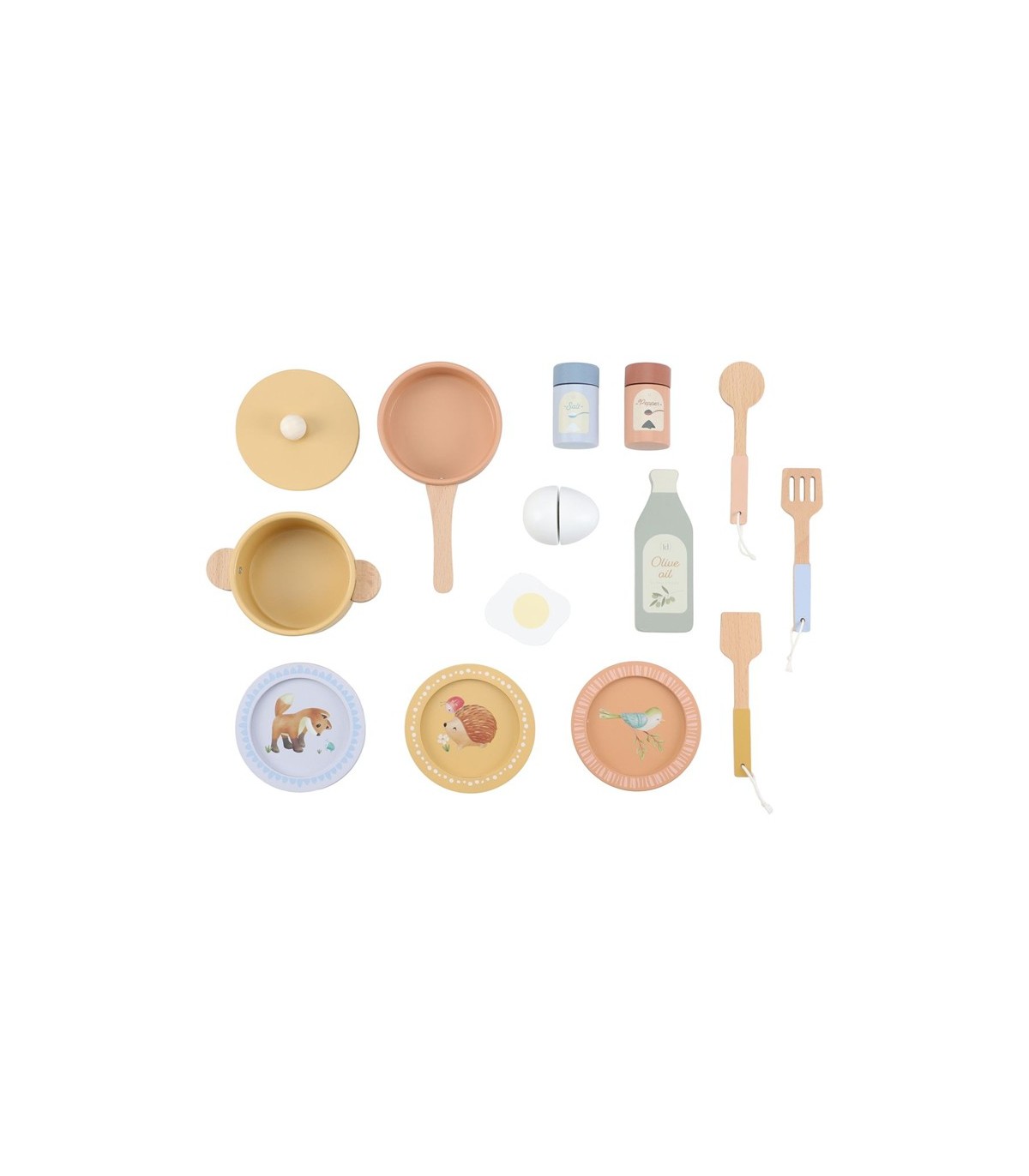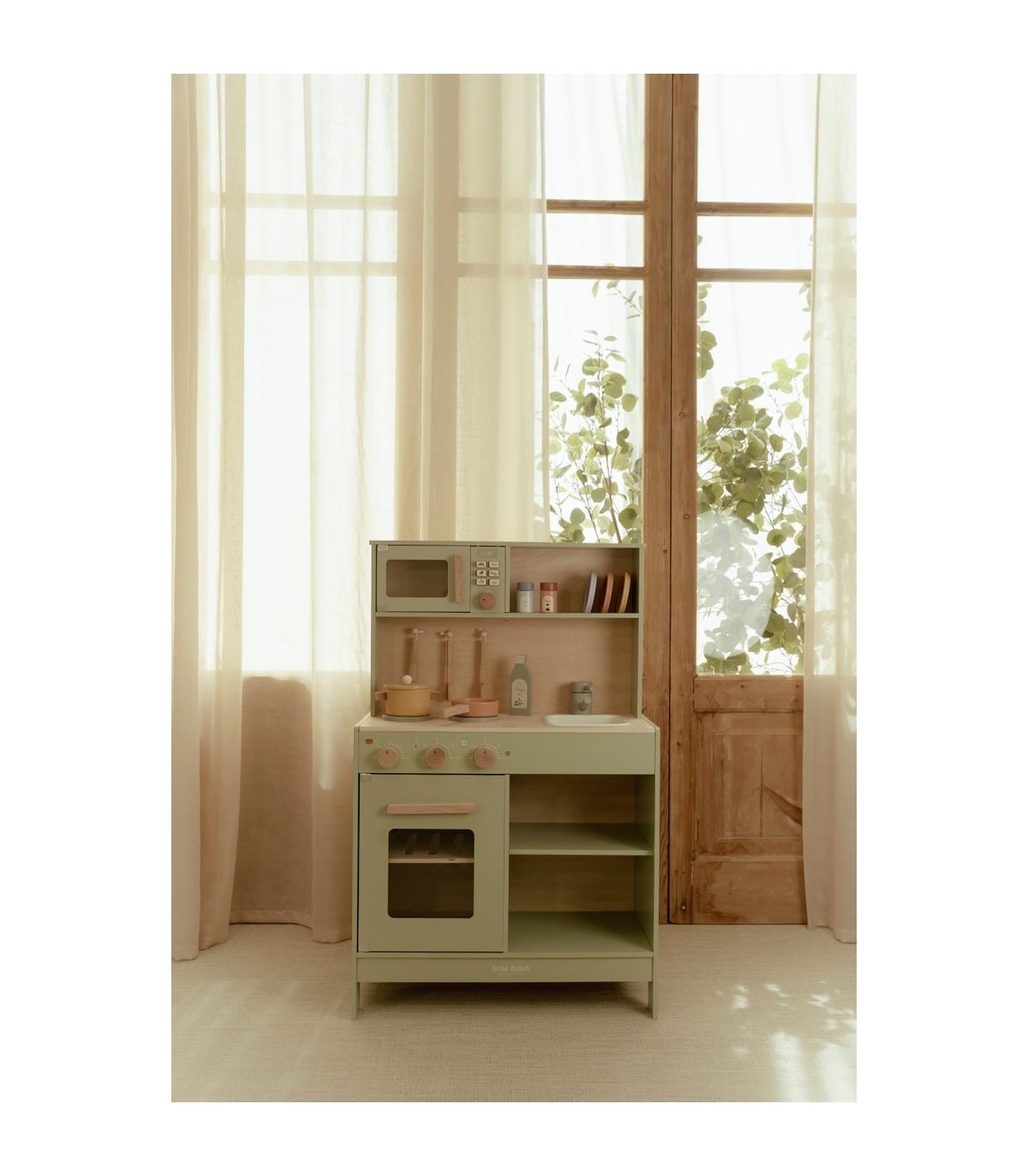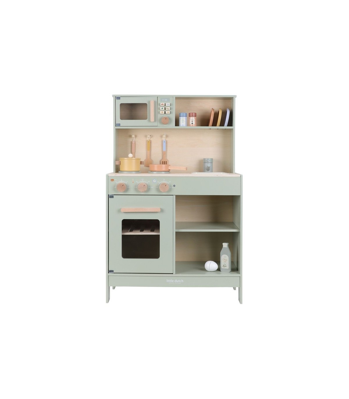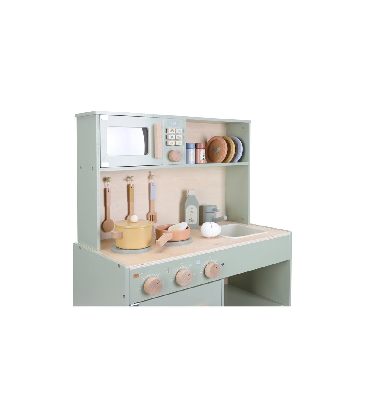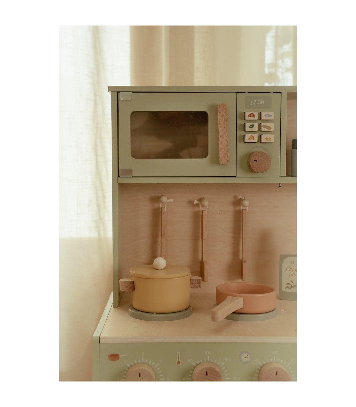 ¡Los pequeños chefs pueden ponerse manos a la obra en esta preciosa cocina de juguete de madera color menta! Hornean un delicioso pastel, cocinan verduras frescas en el horno o fríen un huevo en la sartén. La cocina está completamente equipada con dos sartenes, utensilios de cocina, tres platos y un fregadero para lavarse las manos. También incluye una botella de aceite de oliva, un juego de sal y pimienta, y un armario para guardar los comestibles. El microondas tiene perillas reales con ilustraciones para mayor diversión. ¿Qué hay para cocinar hoy?