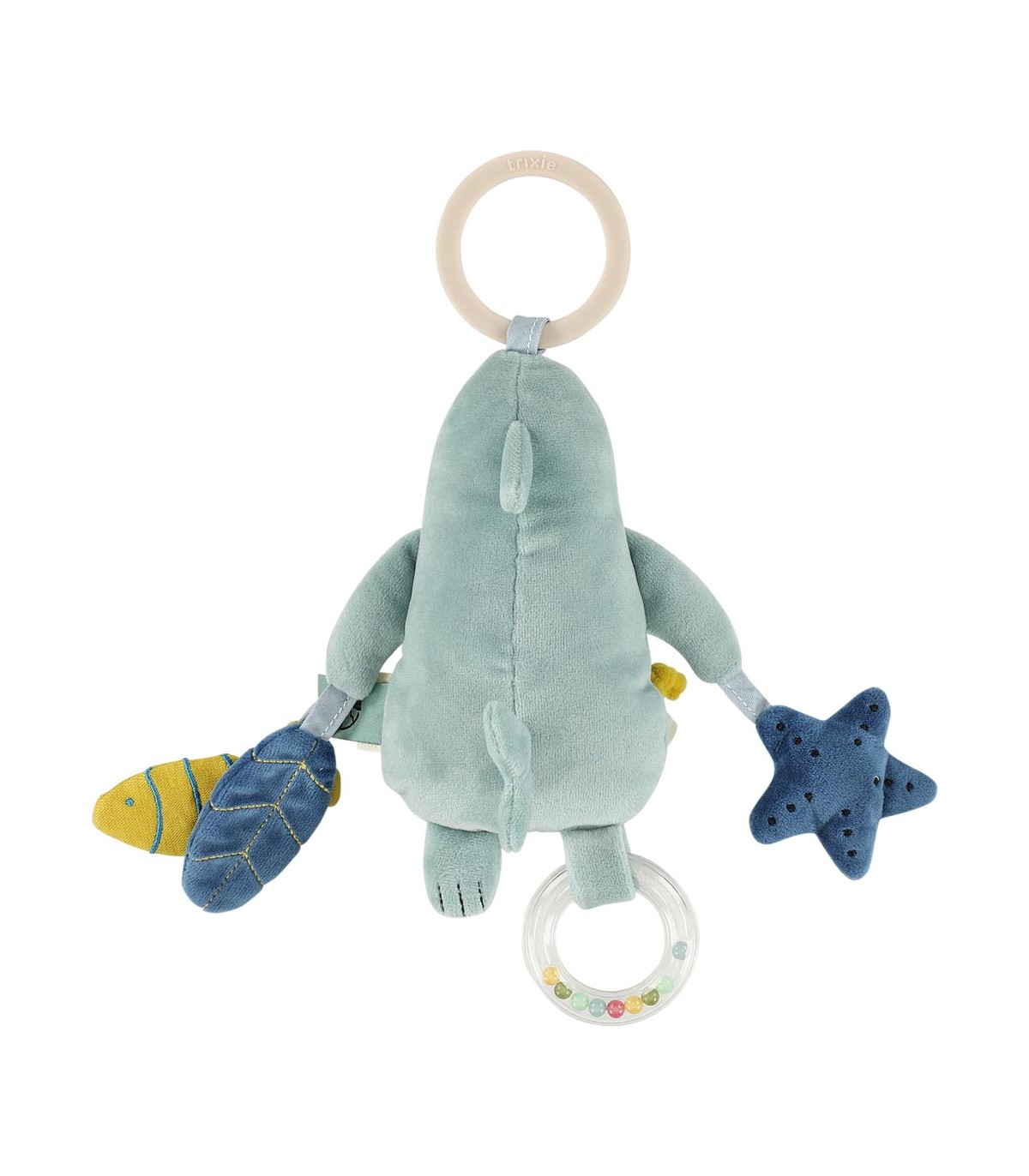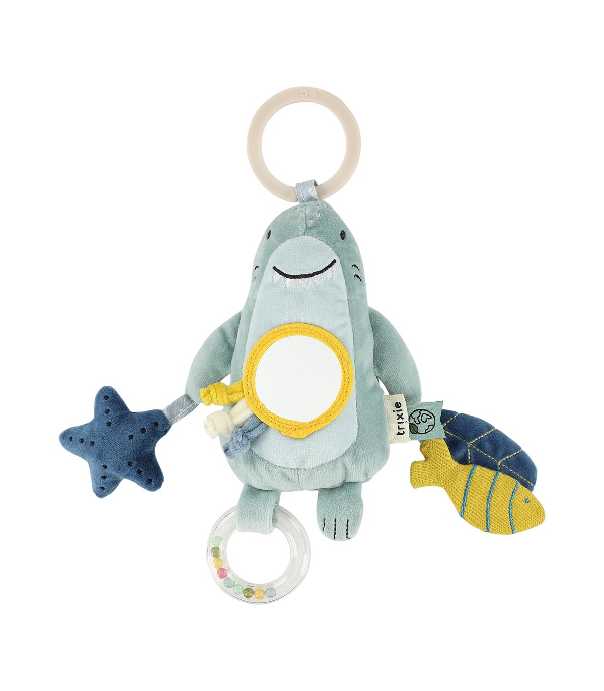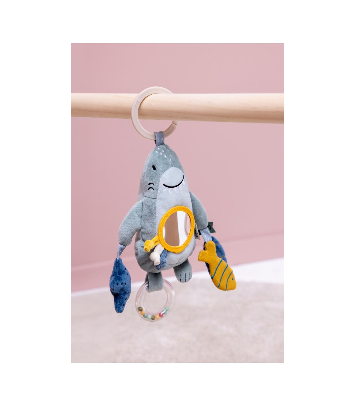 Da igual adónde vayamos, ¡Mr. Shark se apunta! Aporta mucha diversión, gracias a su sonajero de cuentas, al papel arrugado, al espejo de escondite y a las cuerdas para tirar. Todo ello mientras estimula a tu peque y perfecciona sus habilidades motoras, visuales y auditivas. Lo mejor de todo es que Mr. Shark se puede enganchar con seguridad a cualquier cochecito, carrito de la compra, asiento de coche o parque infantil.