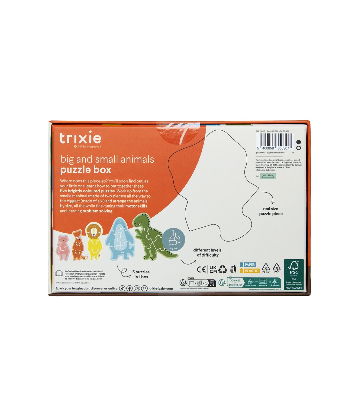 ¿Dónde va esta pieza? Pronto lo descubrirás, cuando tu peque aprenda a armar estos cinco puzzles de vivos colores. Trabaja desde el animal más pequeño (compuesto por dos piezas) hasta el más grande (¡compuesto por seis!) y ordena los animales por tamaño, a la vez que perfecciona sus habilidades motoras y aprende a resolver problemas.