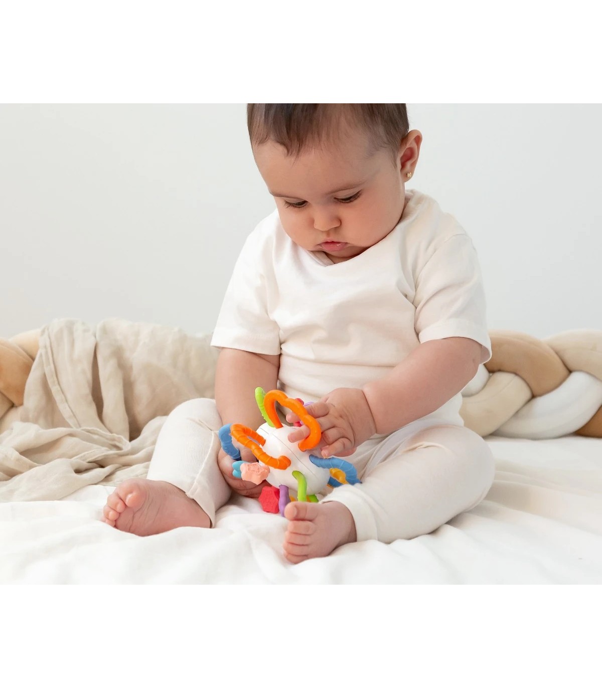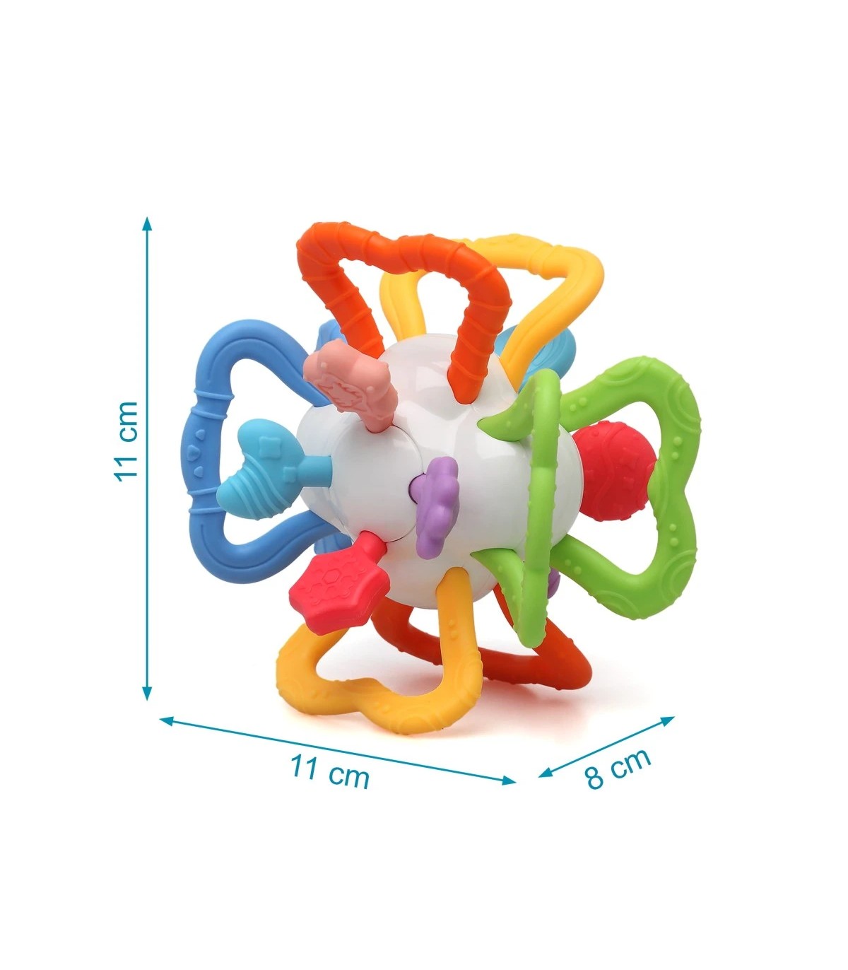 Fabricado con ABS y TPE, materiales seguros y duraderos, su diseño entrelazado es fácil de agarrar, mejorando la motricidad fina. Es el compañero perfecto para la dentición y el desarrollo sensorial de tu bebé, práctico y divertido.