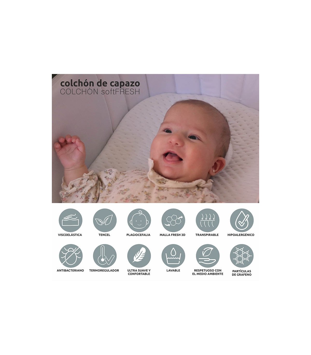 • Capazo Flowy con colchón softFRESH. Con tejido soft hipoalergénico y perforaciones laterales para asegurar una ambiente óptimo para tu bebé.