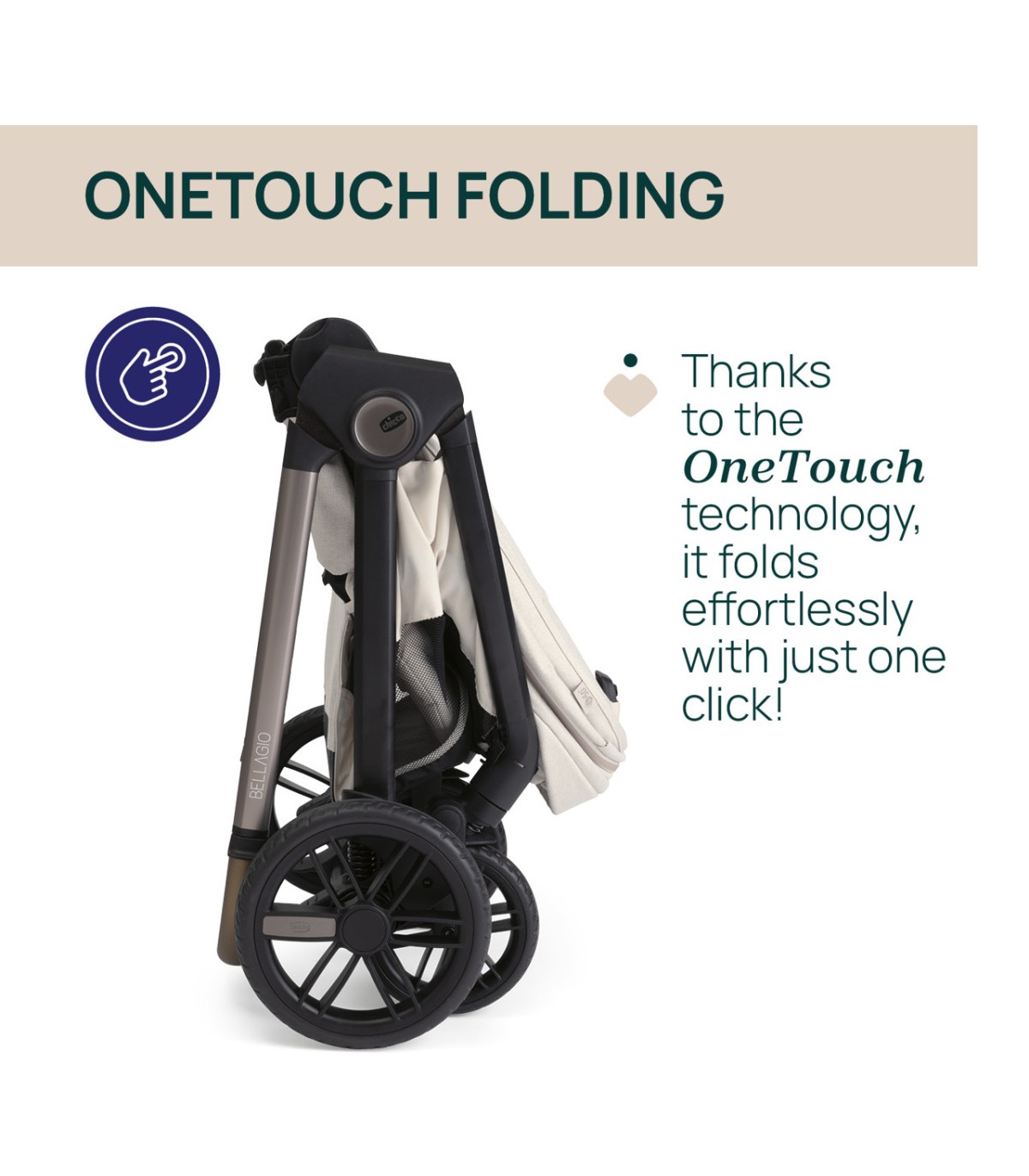Gracias a la tecnología One Touch, el cochecito Bellagio se cierra con solo pulsar un botón. Una vez plegado, se mantiene de pie por si solo e incluye un asa de transporte para poder llevarlo fácilmente.