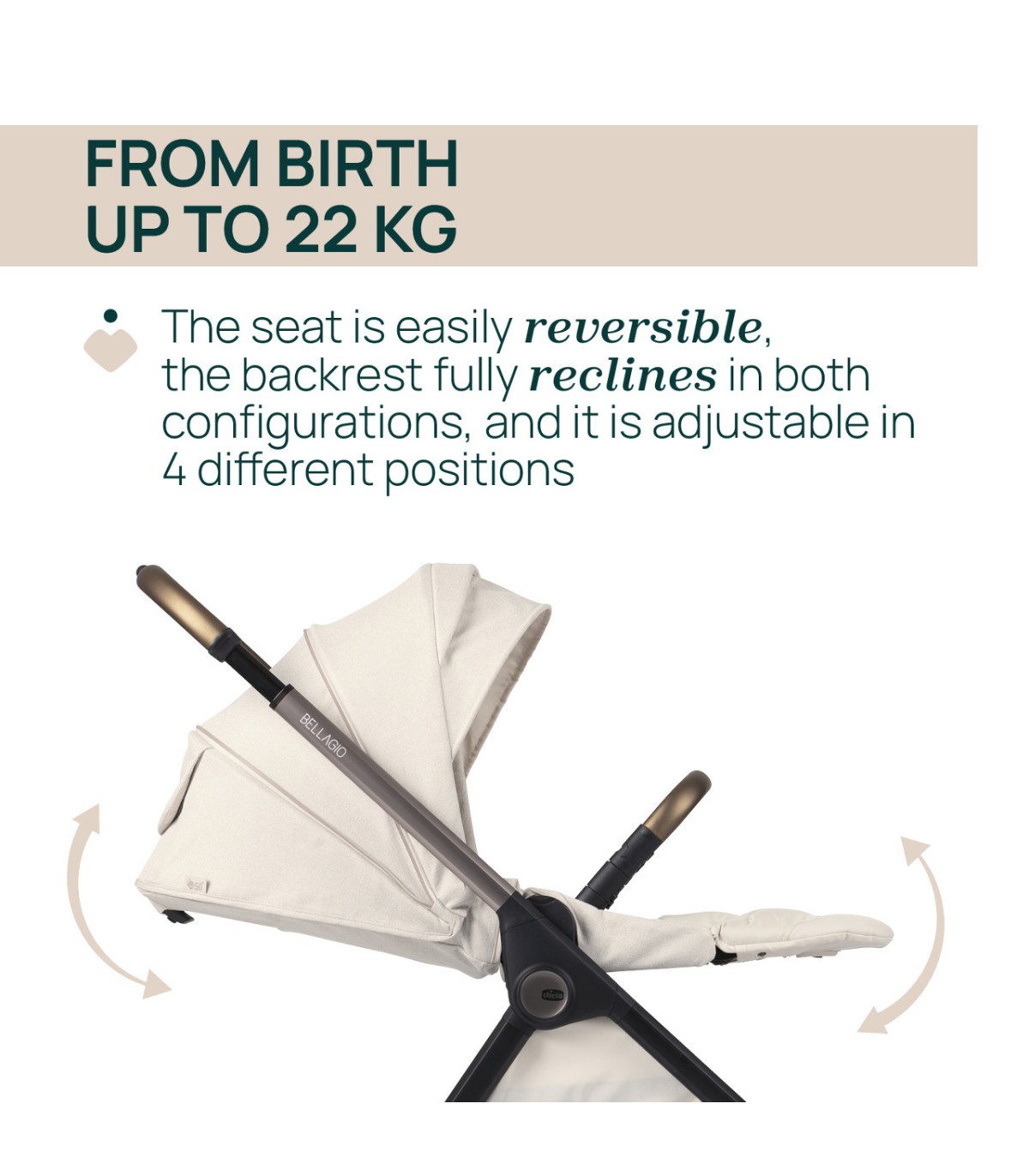 El asiento de la silla Bellagio es fácilmente reversible para que el peque pueda ir mirando al mundo o hacia los papás. Además, cuenta con 4 posiciones de reclinado y el reposapiernas es también ajustable.