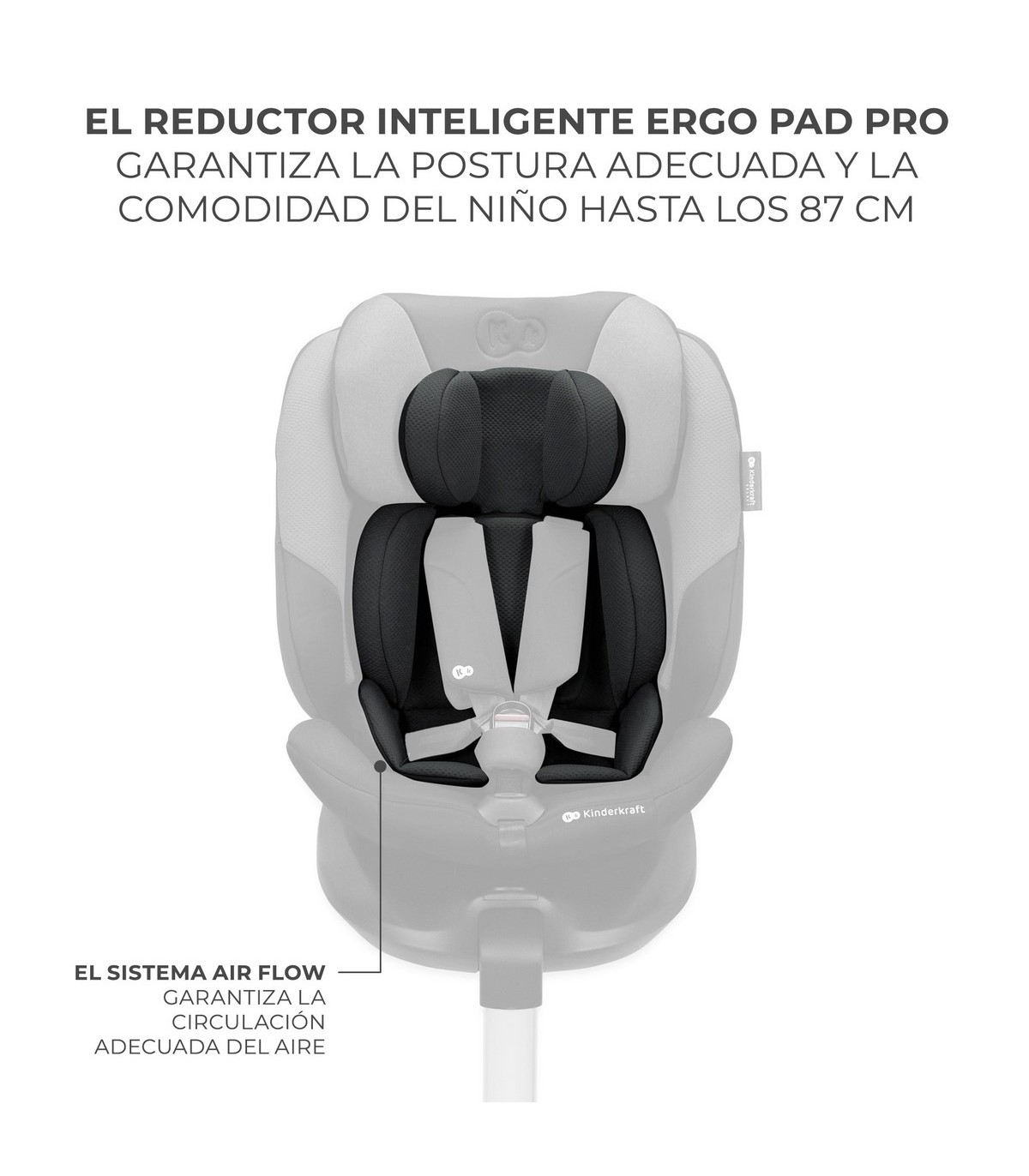 La silla incluye el reductor ERGO PAD PRO con uso extendido hasta los 87 cm de estatura, que ayuda a que el adopte la postura corporal adecuada durante el viaje. El reductor dispone de sistema AIR FLOW que garantiza la ventilación adecuada en los días calurosos.