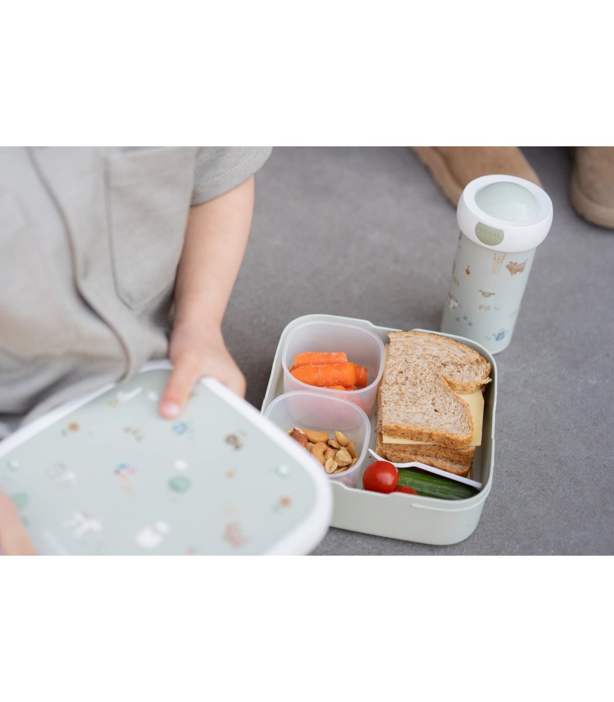 Caja Bento campus grande, mantiene los diferentes alimentos separados gracias a dos cajas bento extraíbles con tapa que contiene, a prueba de fugas. El tenedor cabe dentro de la caja.
